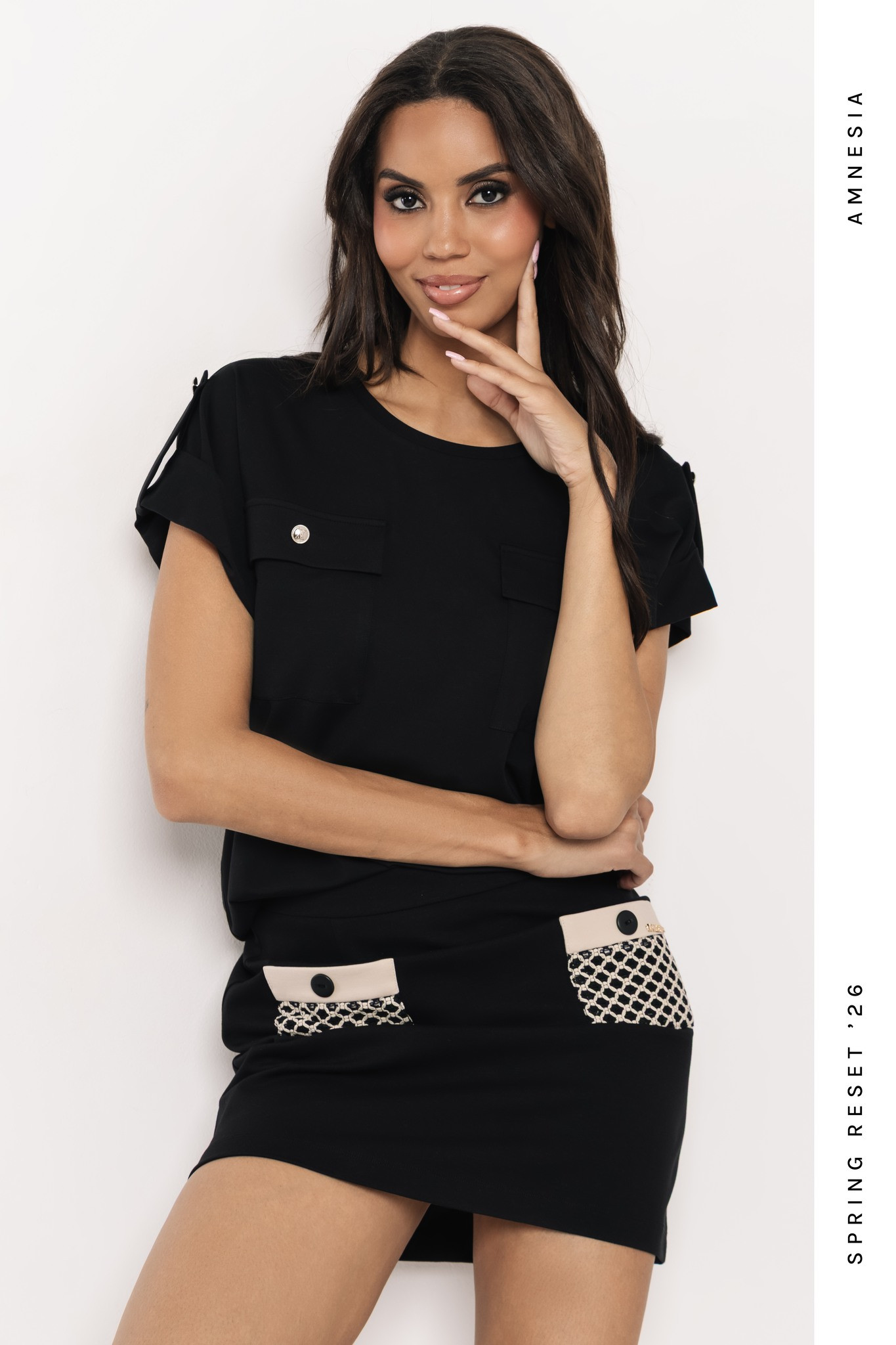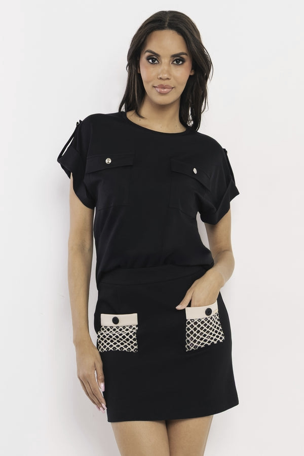 Amnesia felső fekete színben; bővebb szabással; kerek nyakkivágással; rávarrt zsebfebős mellzsebekkel; márkajelzett fémkellékekkel.