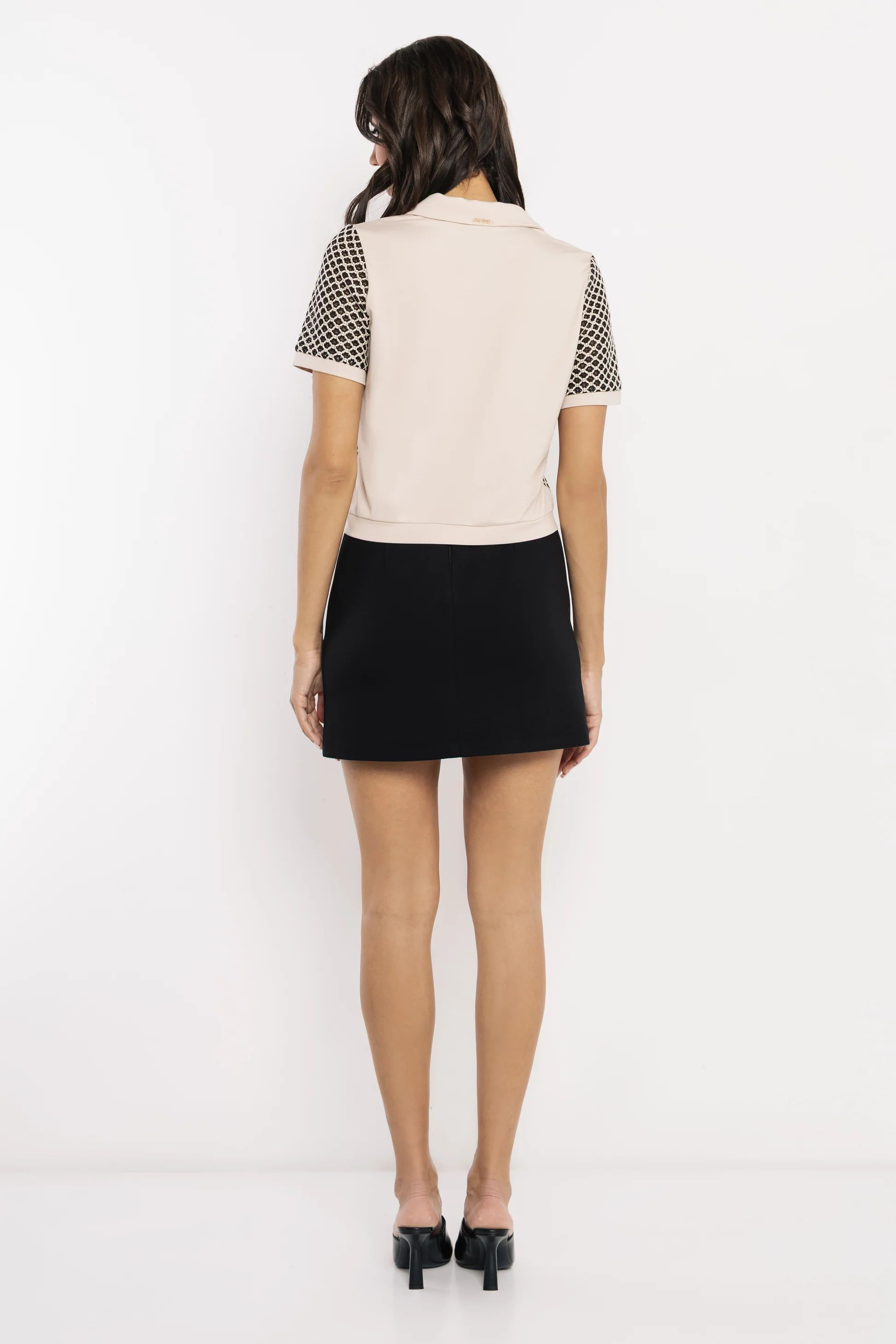 Amnesia felső bézs és fekete színben, elején horgolással és gombos záródással. Gallérján fém márkajelzéssel.