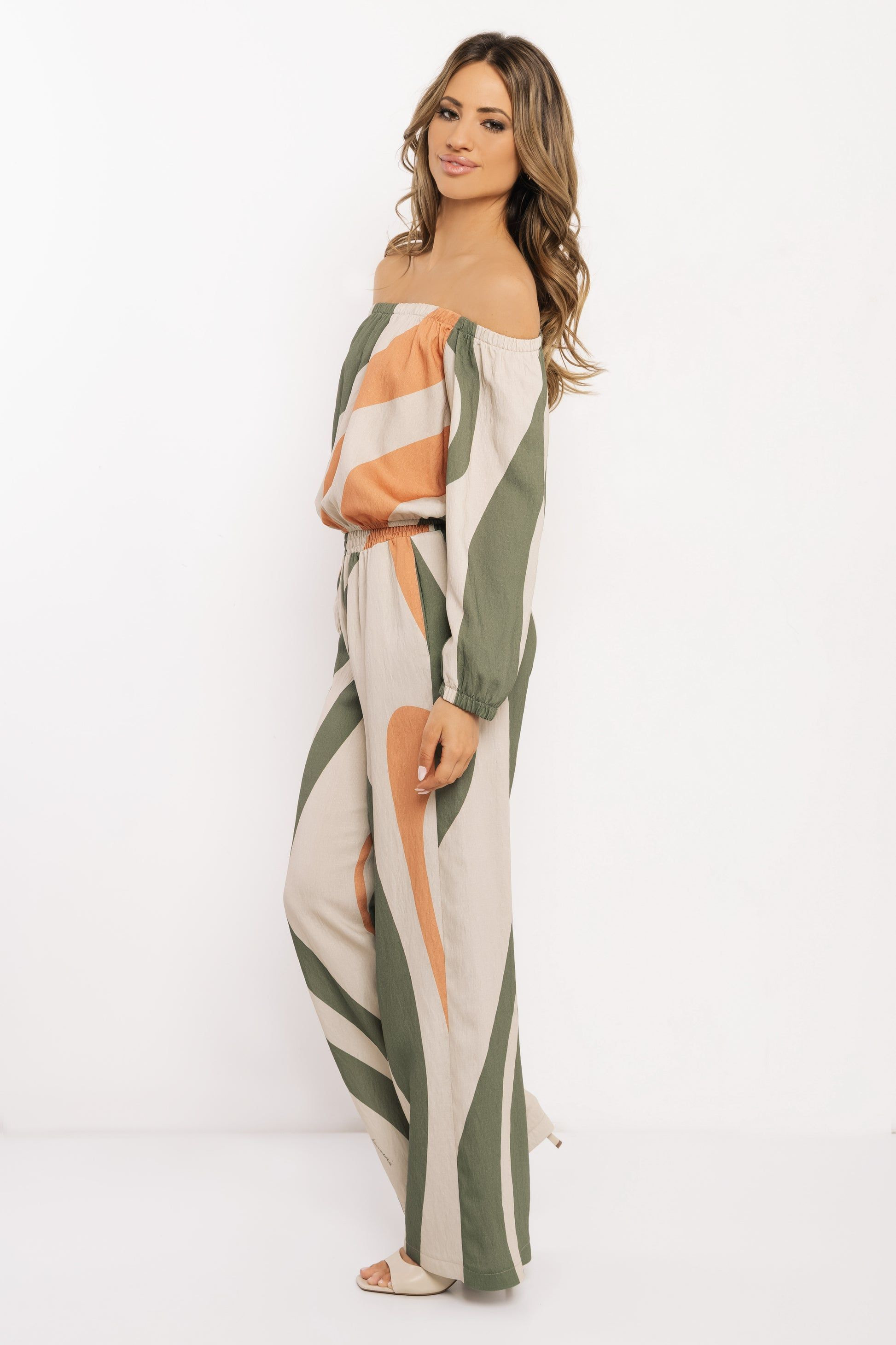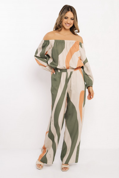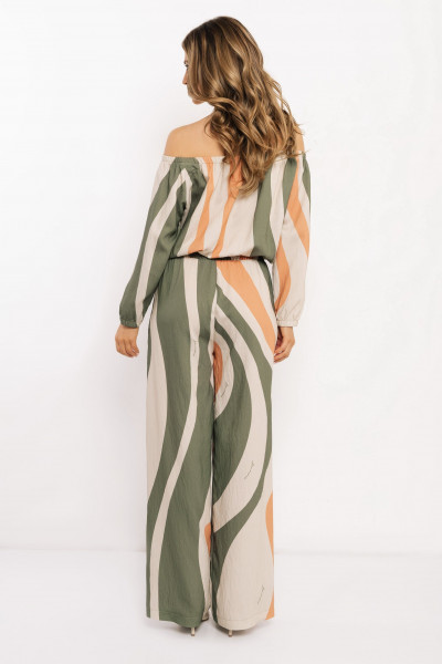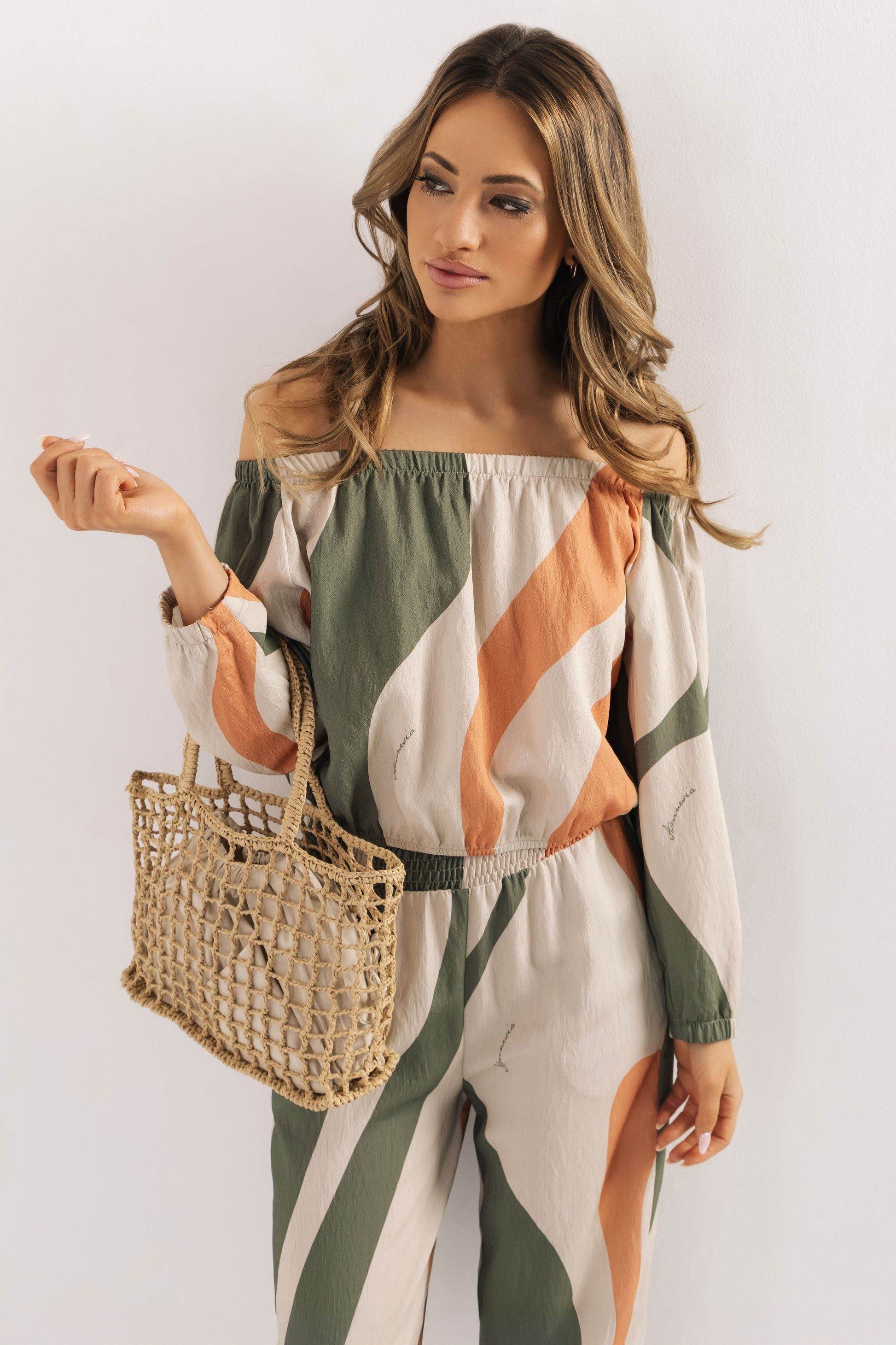 Amnesia rövid fazonú felső, bézs, khaky és tégla színben, hullámos mintával. Gumírozott nyakkivágással, bő ujjakkal, anyagában márkajelzéssel.
