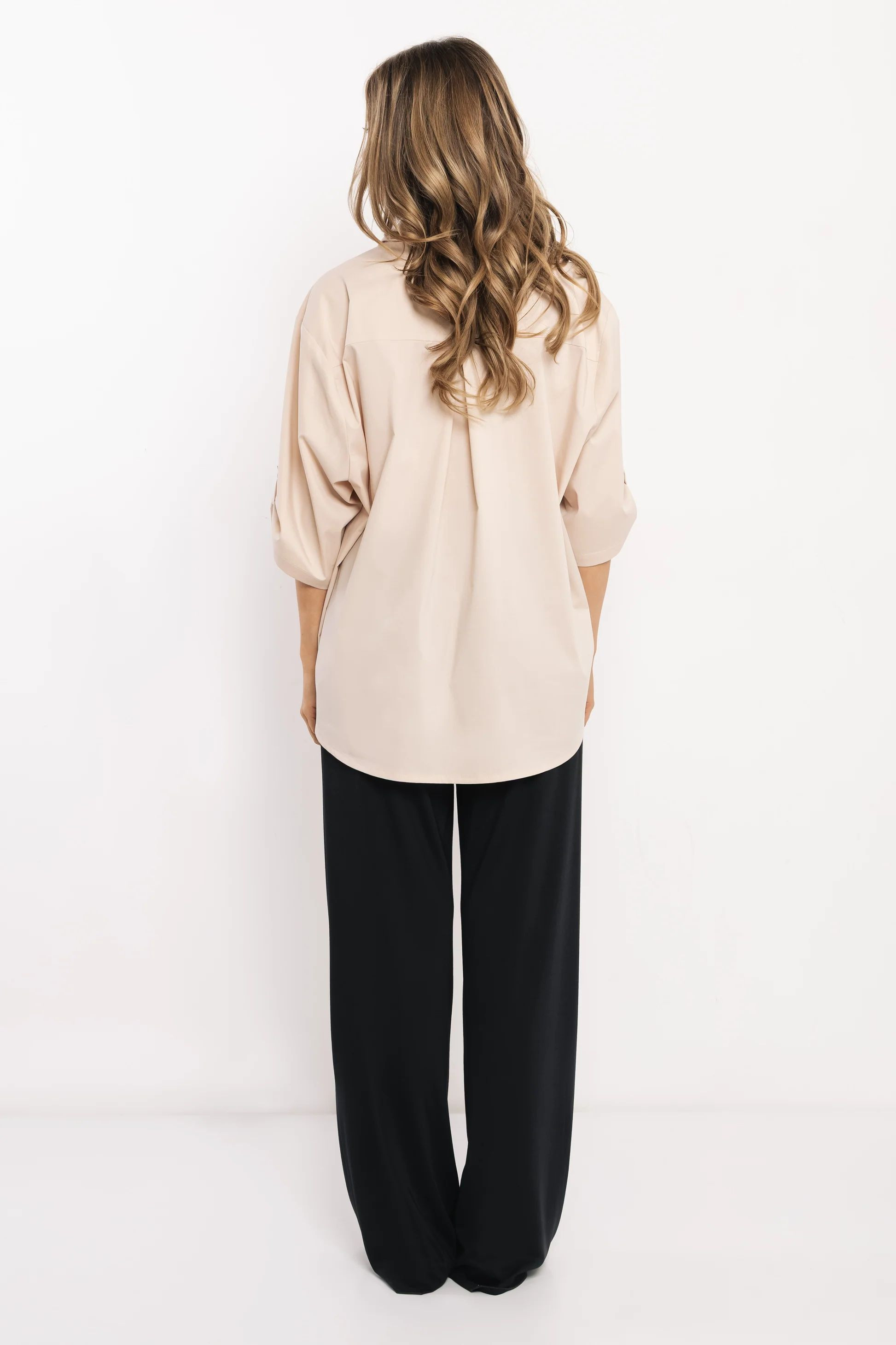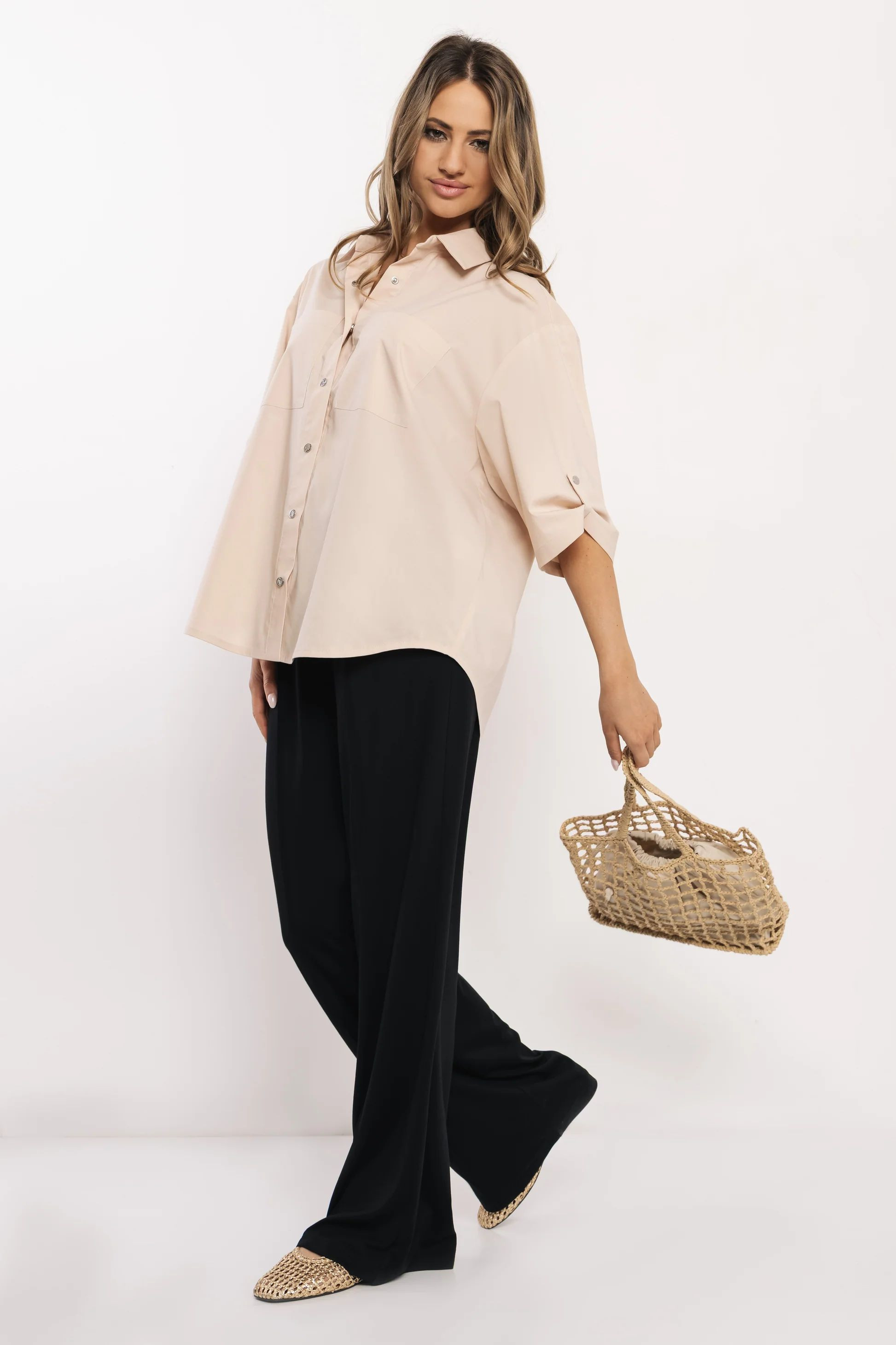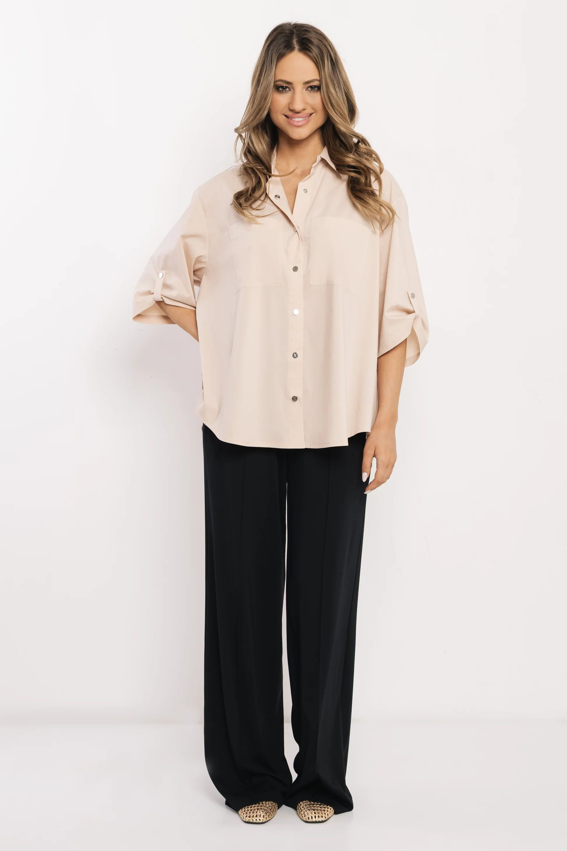 Amnesia over size fazonú ing, bézs színben. Elején patentos záródással, mellszebekkel, ujja felpatentolható, márkajelzett fém kellékekkel.
