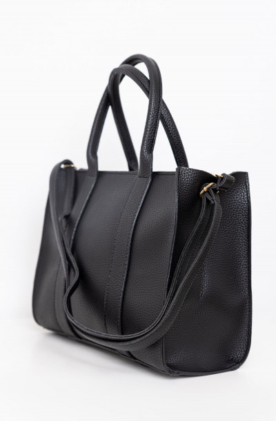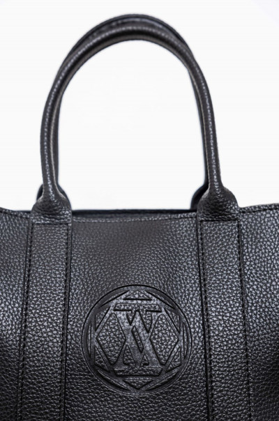 Amnesia Fashion - Eva Prokai műbőr kézitáska fekete színben; egy hosszabb hozzátartozó állítható pánttal; zipzáros záródással; nagyterű belsejében egy zipzáras és két kisebb nyitott zseb található; márkajelzett béléssel; elején dombornyomott márkajelzéssel.