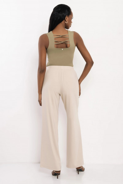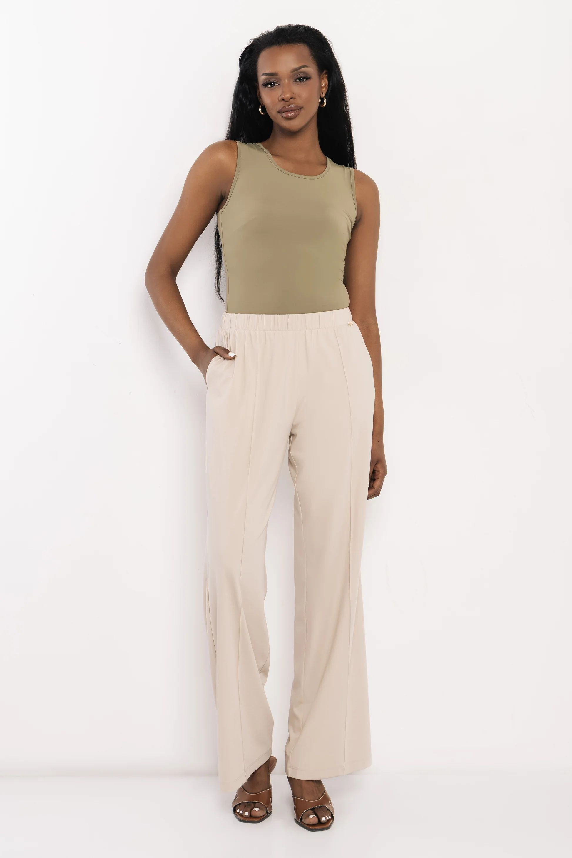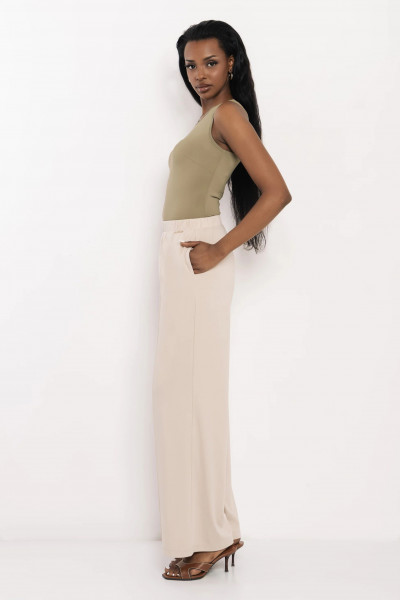 Amnesia bő szárú, lenge nadrág, bézs színben. Gumis derékkal, oldalzsebekkel, szárán dísztűzéssel, derekán fém márkajelzéssel.