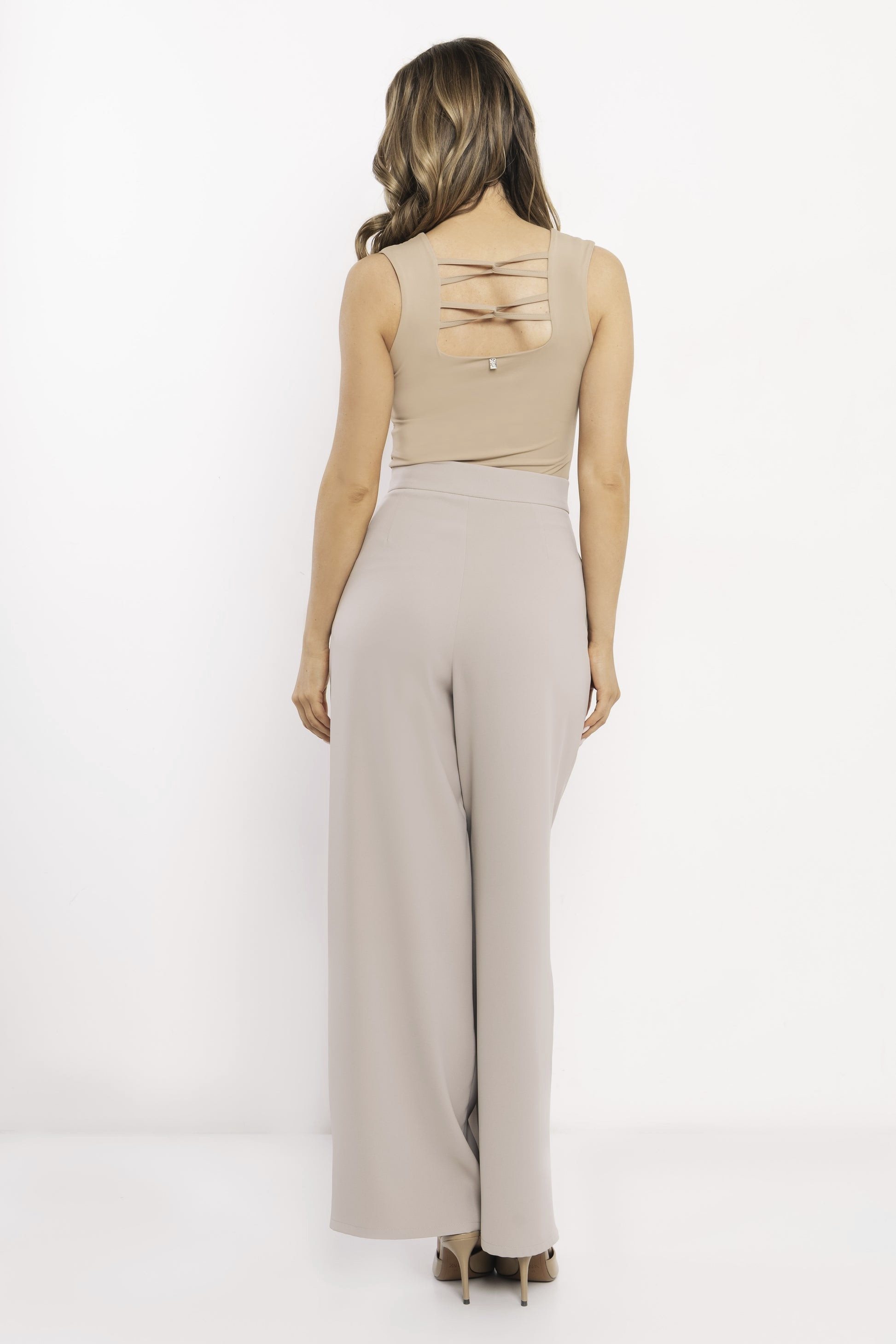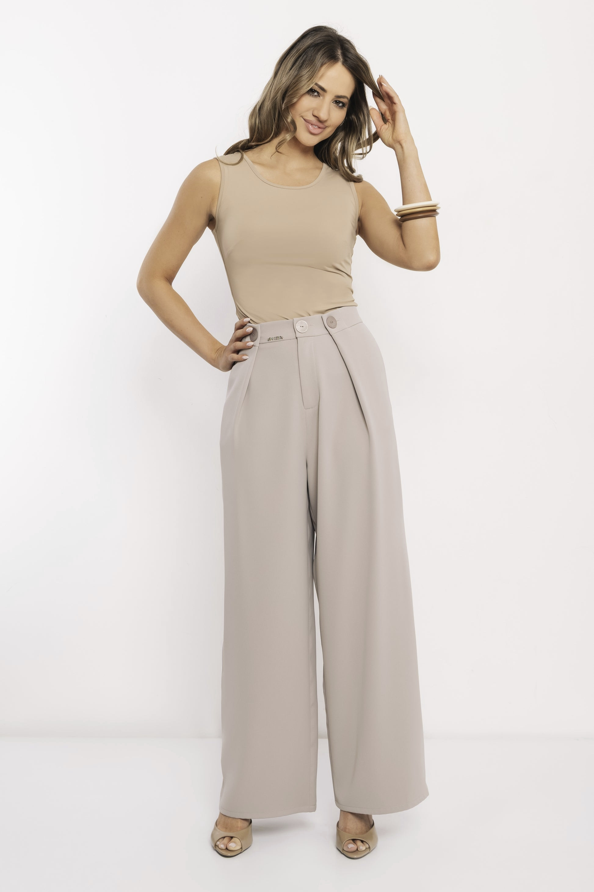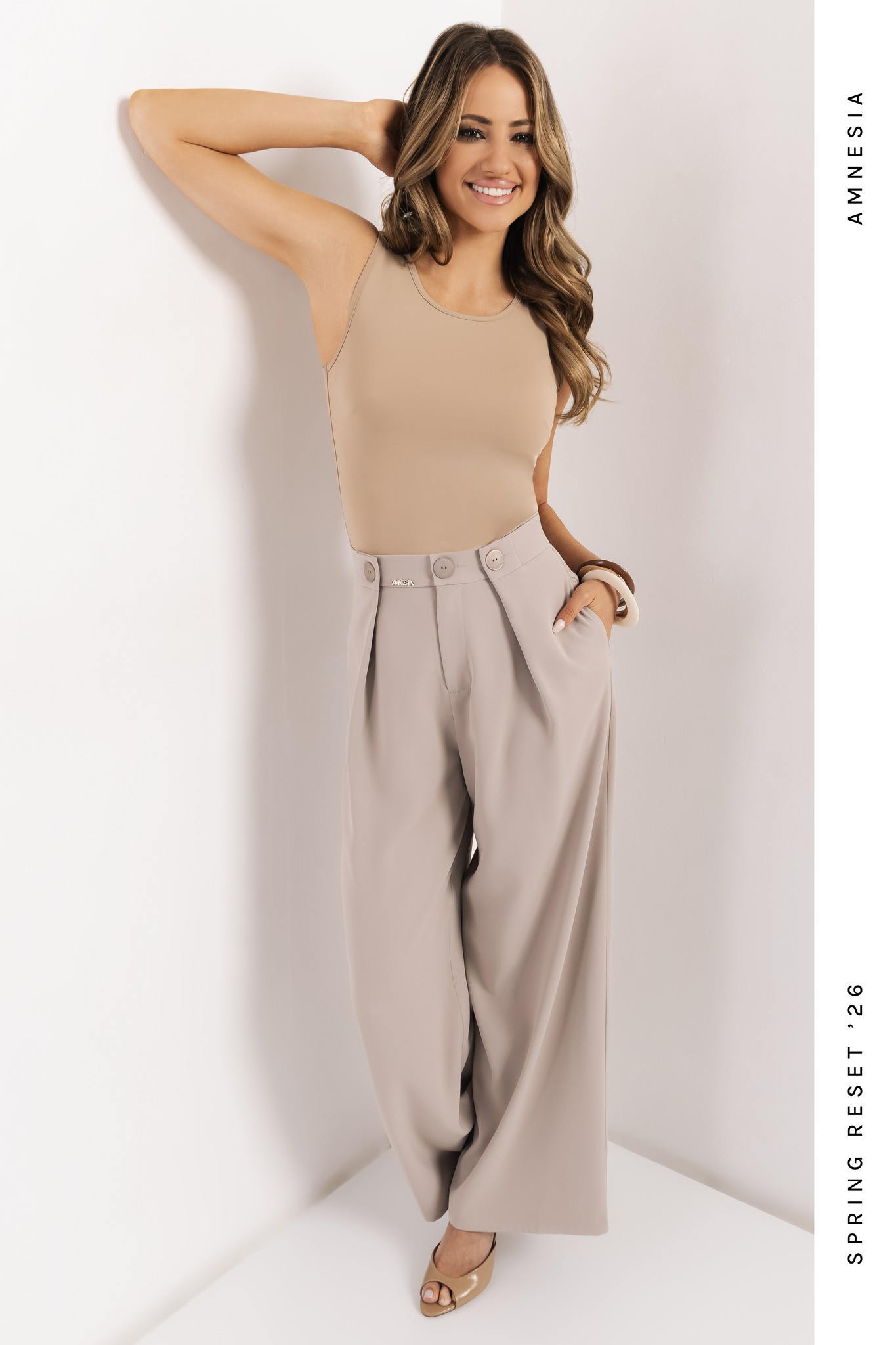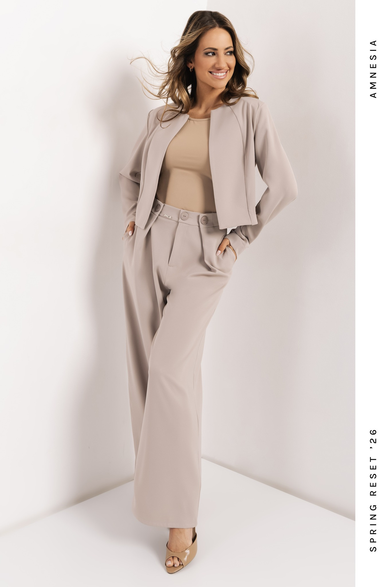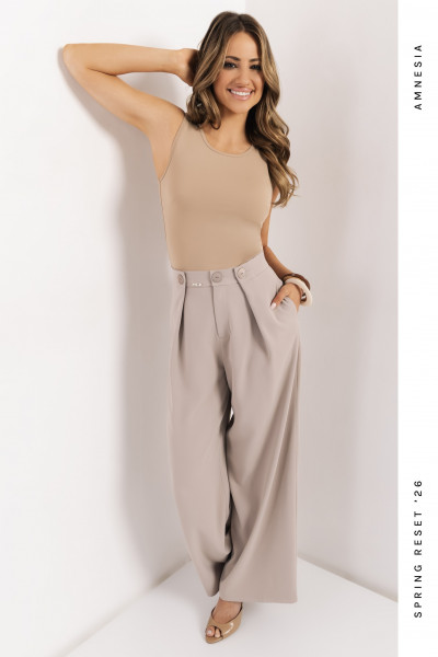 Amnesia elegáns nadrág fangó színben; bő szárral; magasított derékkal; gombos és zipzáros záródással; dekoratív hajtásokkal; szabásvonalba rejtett oldalzsebekkel; elején diszkrét fém márkajelzéssel.