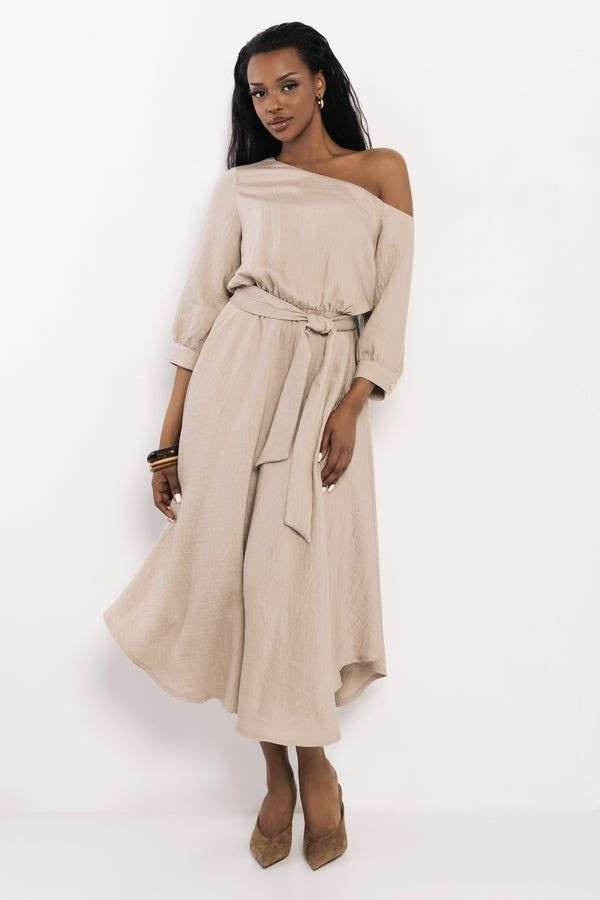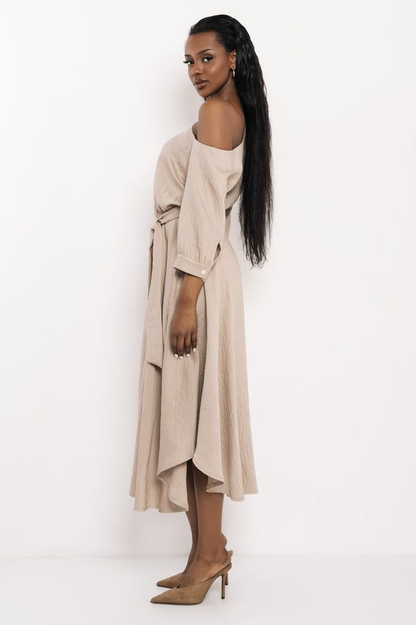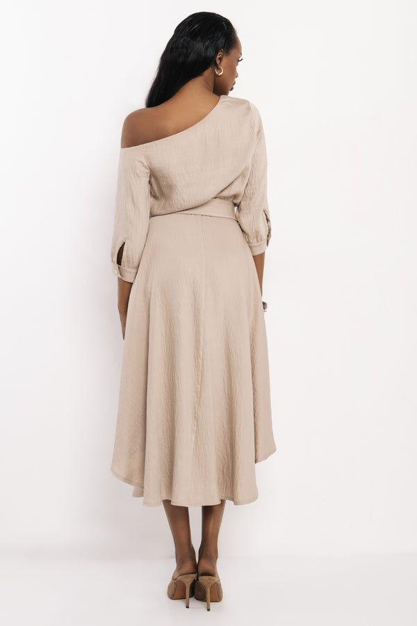 Amnesia ruha fangó. Bővebb fazonban, asszimetrikus nyak kivágással, gombos ujjakkal, gumírozott derékkal, anyagában márkajelzéssel.