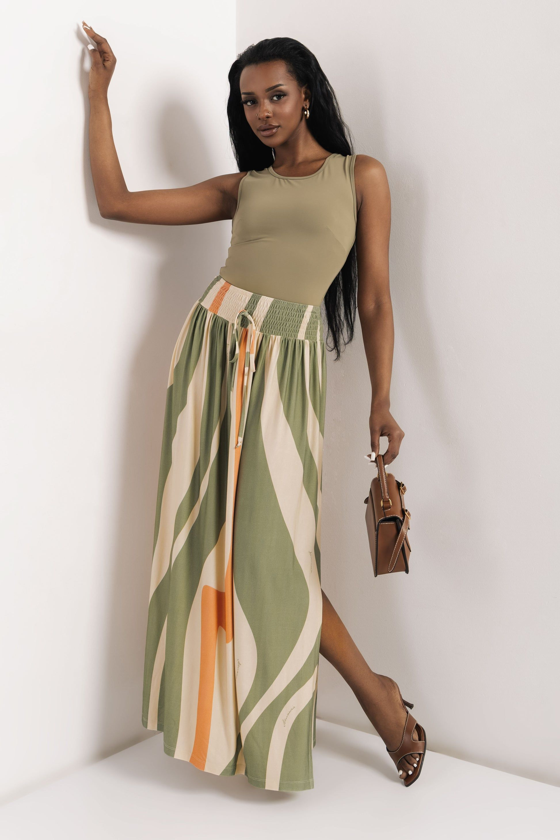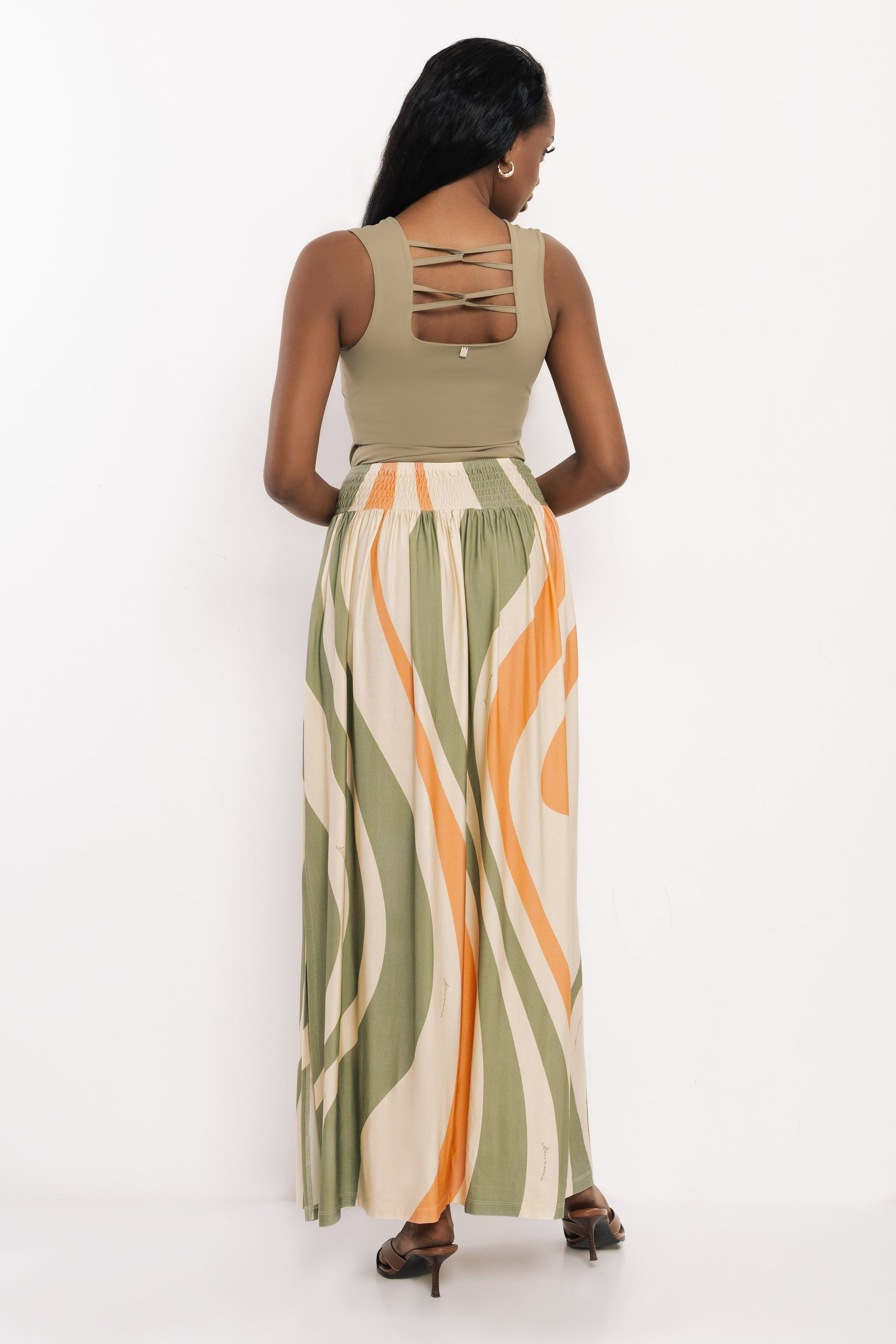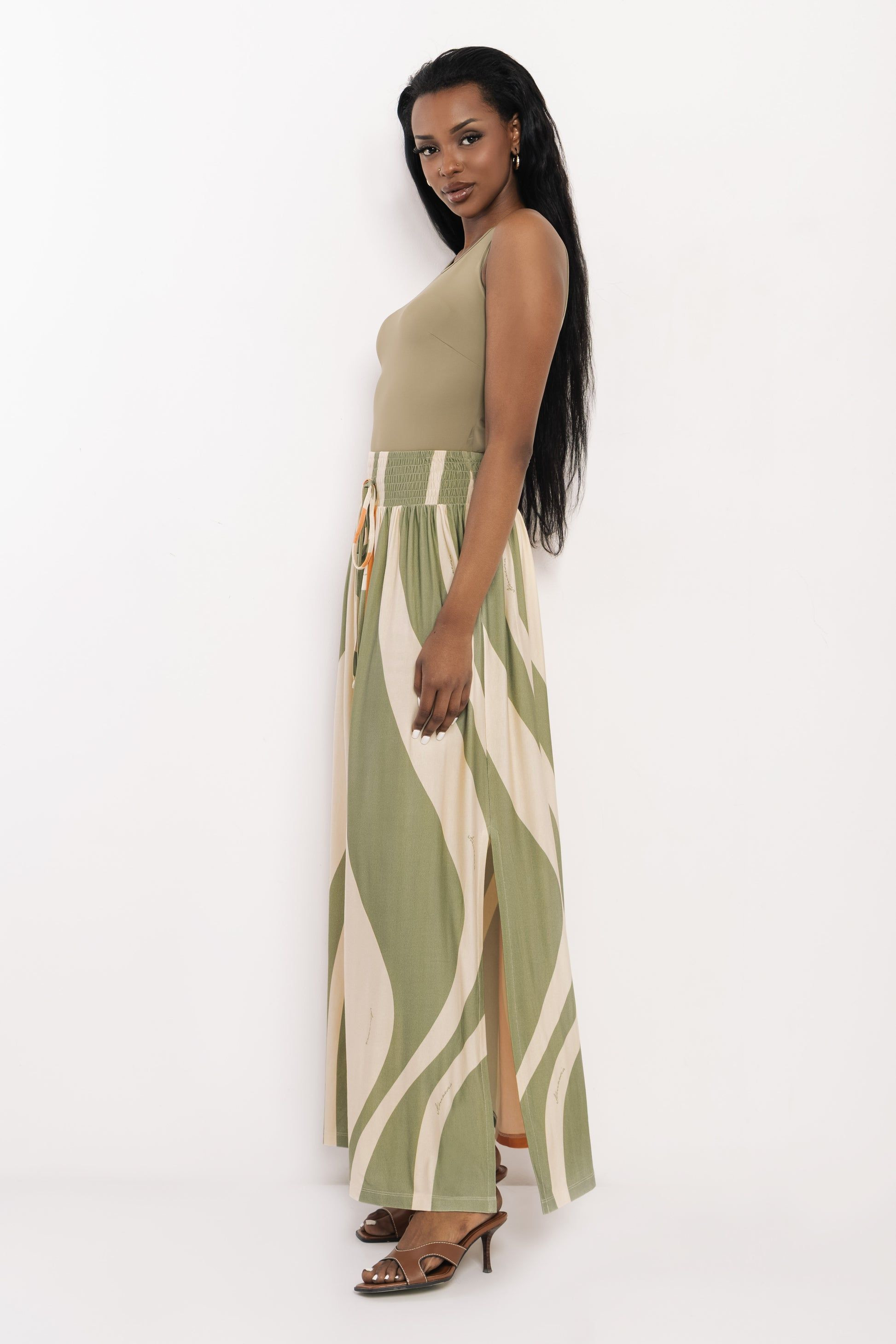 Amnesia oldalán sliccelt maxi szoknya. Bézs, khaky és tégla színben, hullámos mintával. Gumírozott derékkal, dísz megkötővel, könnyű pamut anyagból, anyagában márkajelzett.