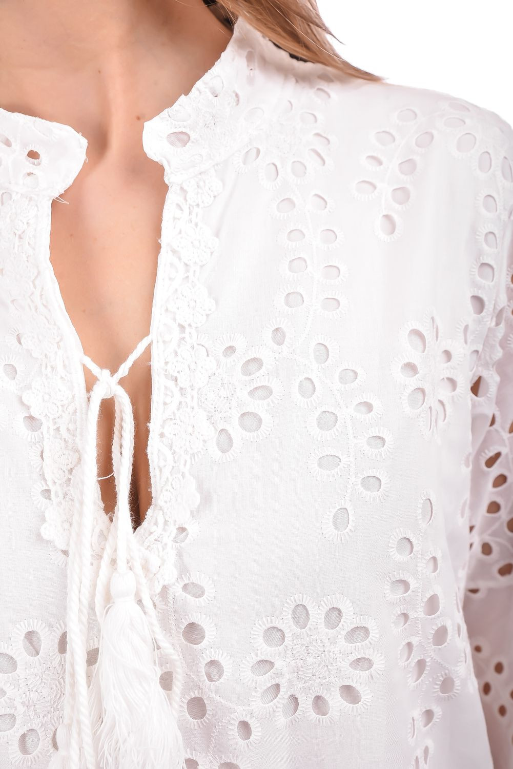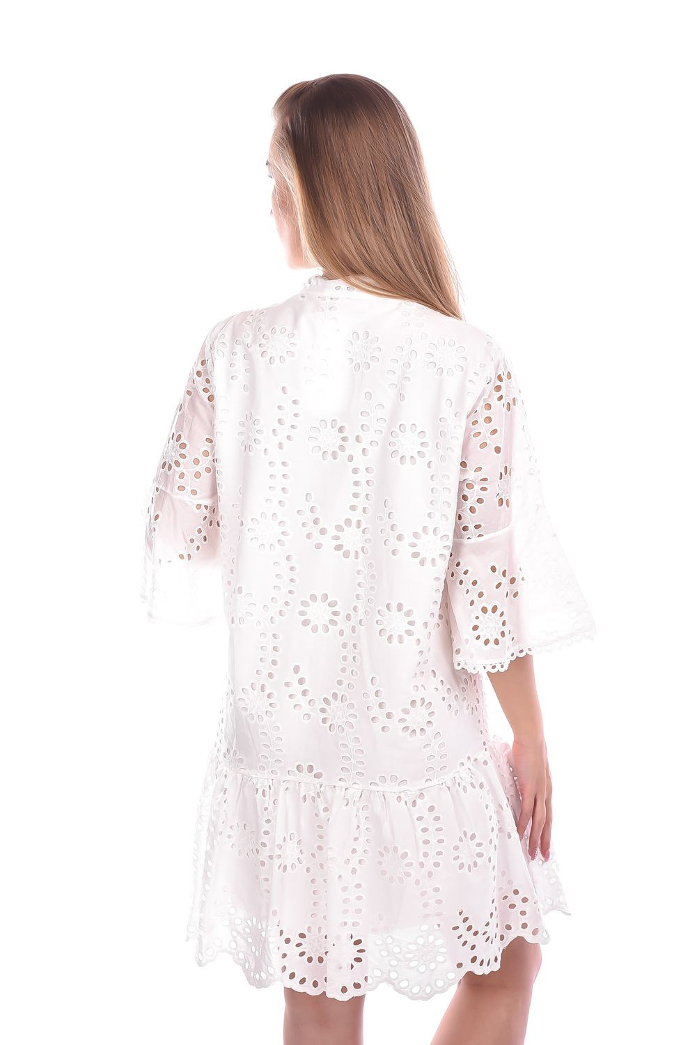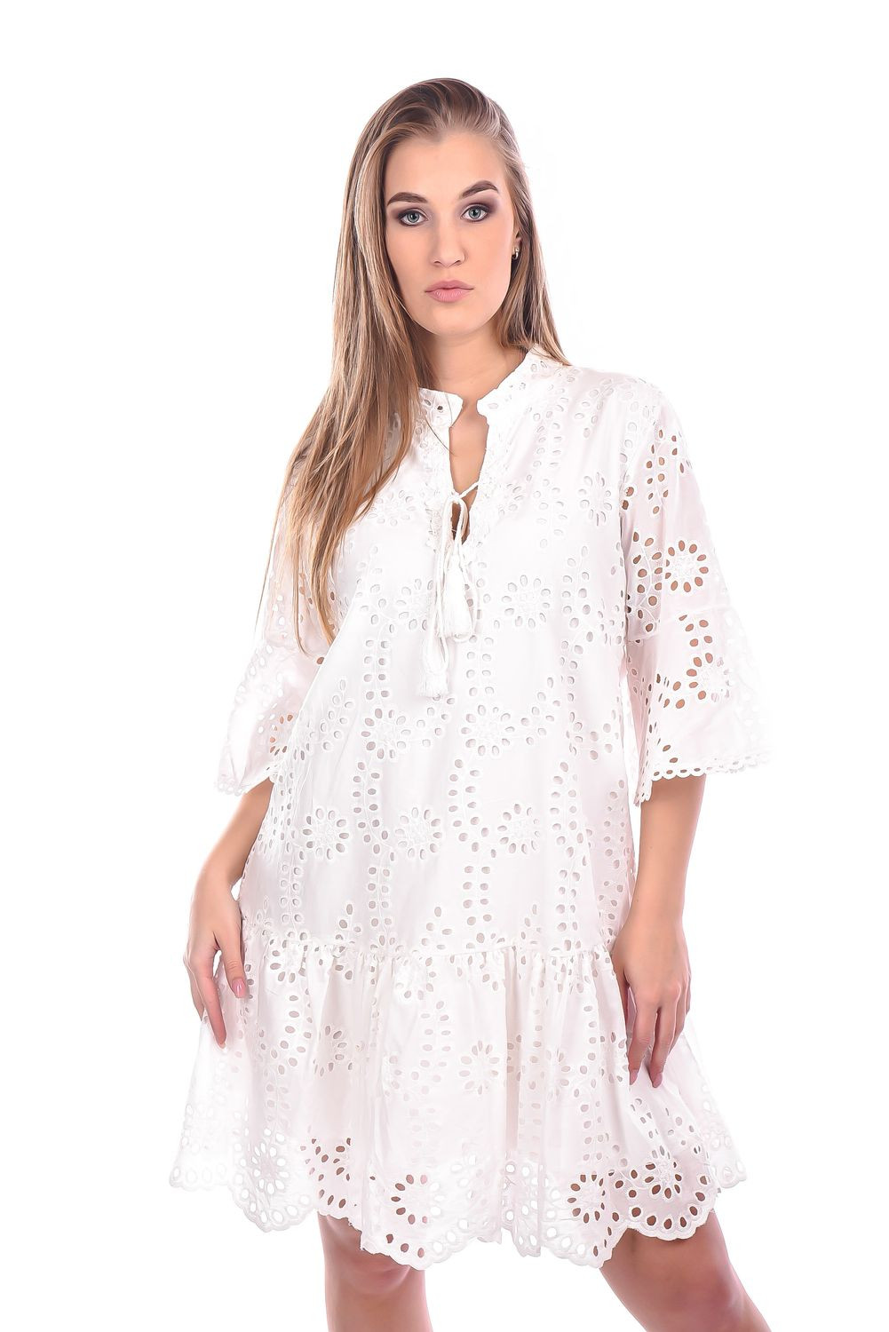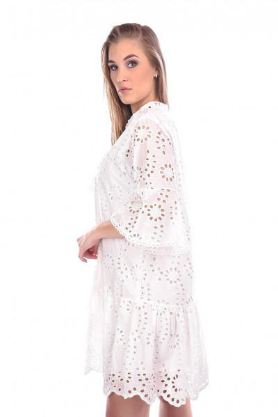 Blu Royal madeira csipke ruha ekrü színben; bővebb fazonban; harang ujjakkal; alján fodorral; elején rojtos megkötővel. Bélelt.