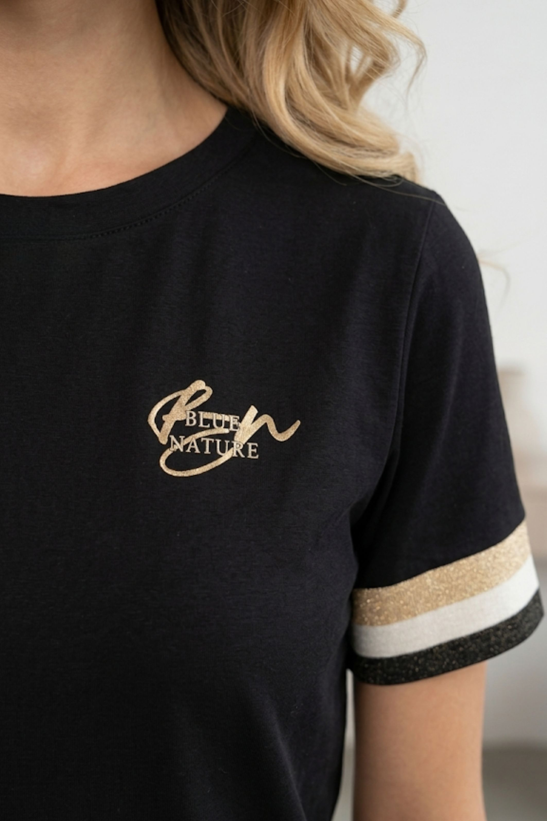Blue Nature bővebb szabású felső fekete színben; kerek nyakkivágással; ujján és alján lurex szálas passzéval; mell részén színben harmonizáló filmnyomott márkajelzéssel.