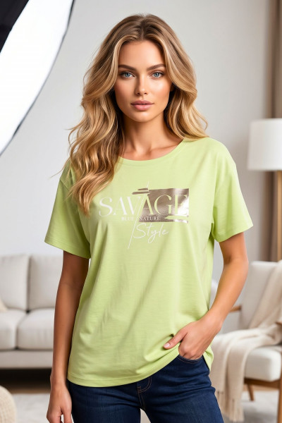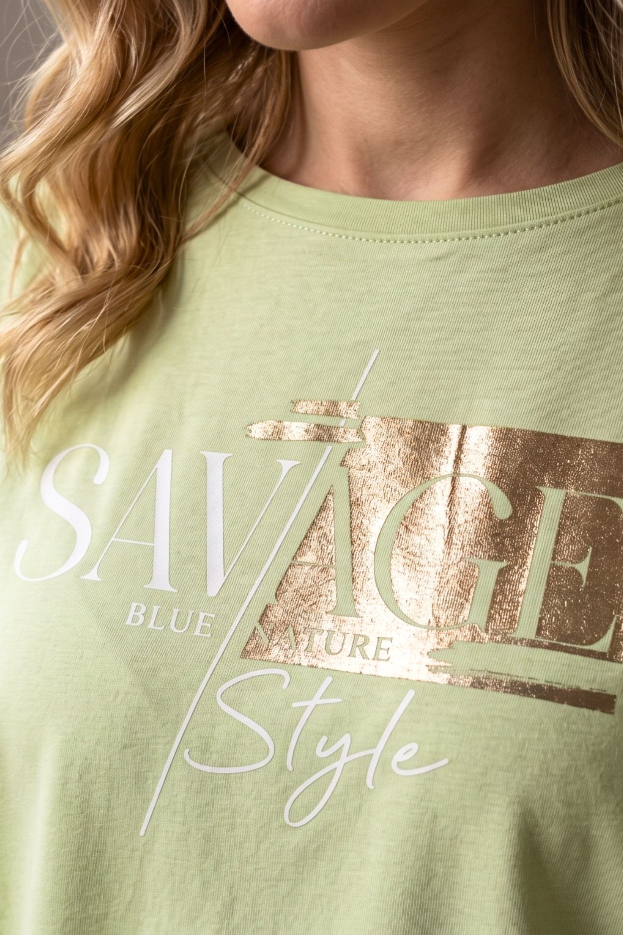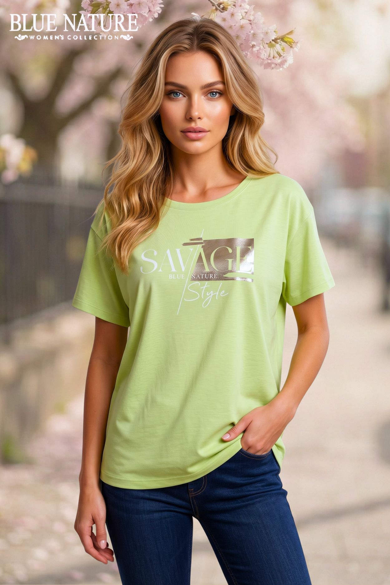 Blue Nature női felső, bővebb fazonban, banánzöld színben, kerek nyakkivágással, elején filmnyomott felirattal, alján fém márkajelzéssel.