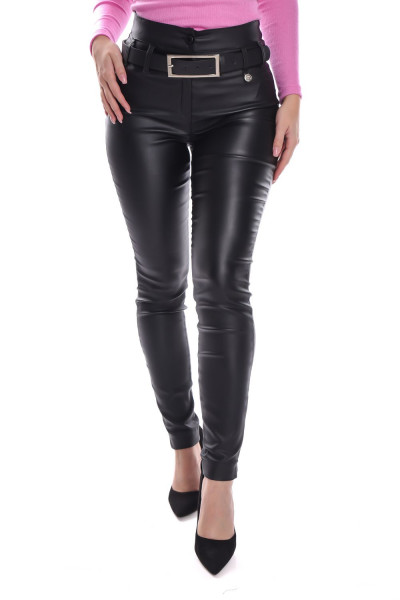 Blue Nature női enyhén elasztikus bevont nadrág fekete színben; magasított derékkal; elejében dupla gombos és zipzáros záródással; alján minimális hasítékkal; hozzátartozó övvel; oldalán rávarrt márkajelzéssel.
