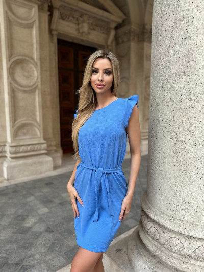 Blue Nature női ruha, kék színben, fodros ujjal, derekán anyagából megkötővel, hátán kivágással és megkötővel valamint fém márkajelzéssel.