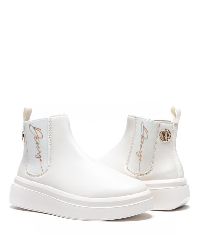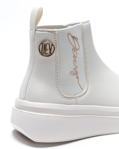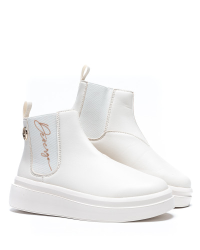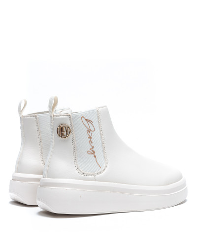 DevergoJeans női bokacsizma bézs színben, magasított szárral, vastag, bézs színű talprésszel, két oldalában bézs színű gumibetéttel, rajta filmnyomott-, szárán kisméretű szegecselt fém márkajelzéssel.