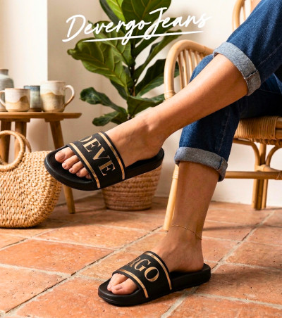 Ez a letisztult női papucs fényes arany DEVERGO logóval díszített pántot kapott, amely karakteres, divatos megjelenést kölcsönöz. Könnyű, mérsékelten vízálló és kényelmes viselet, ideális választás nyári napokra a parton vagy a városban.