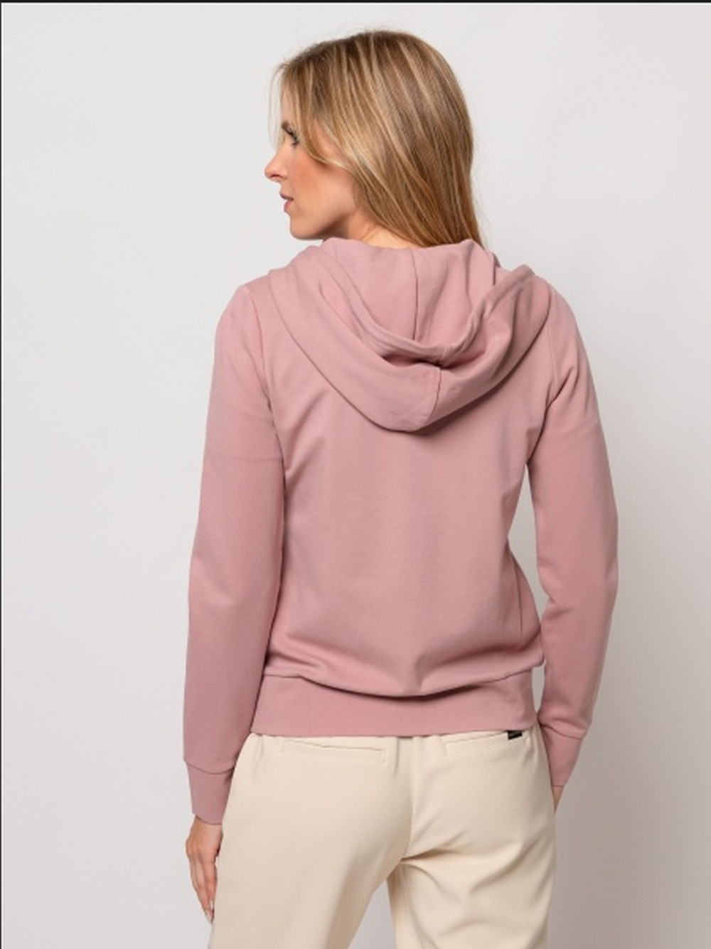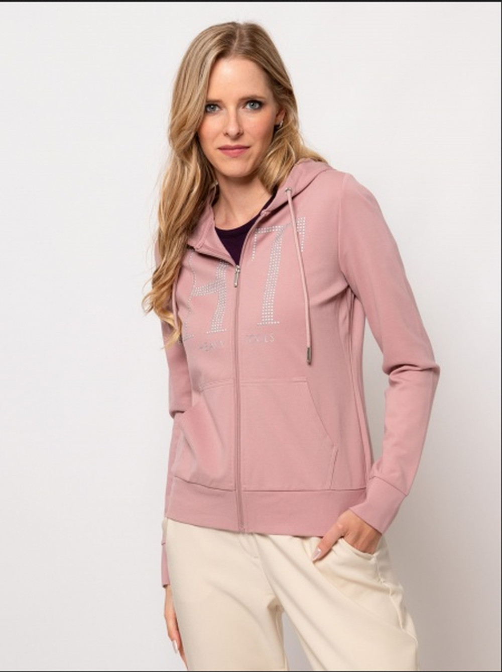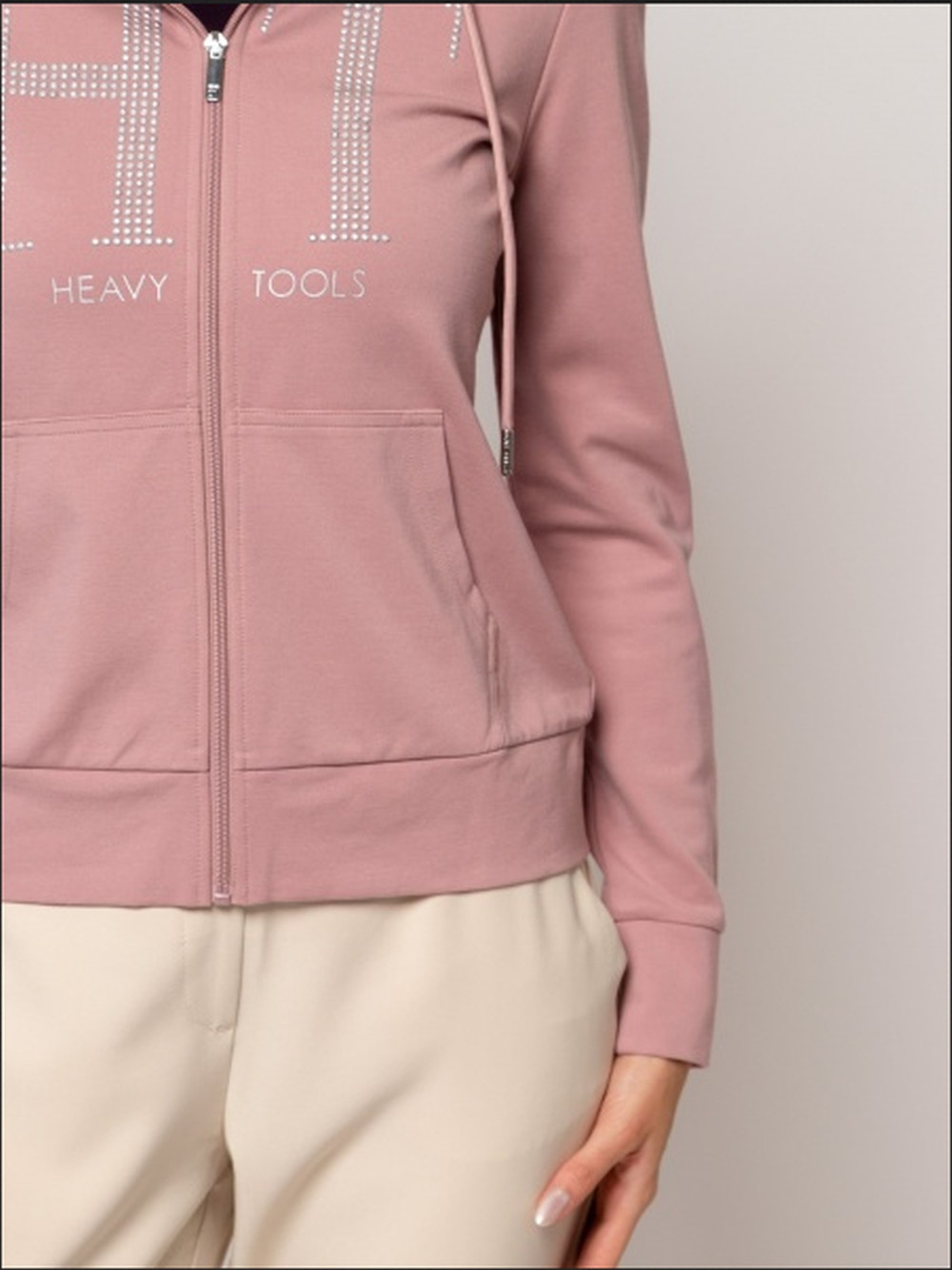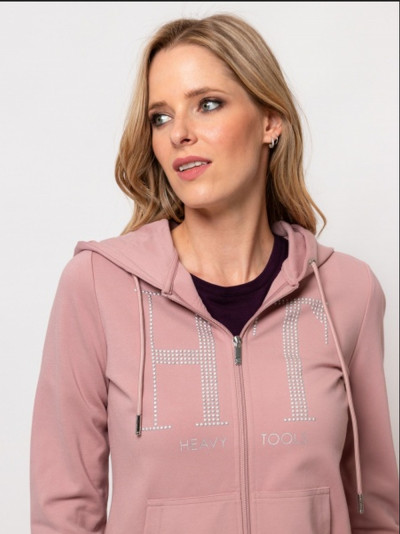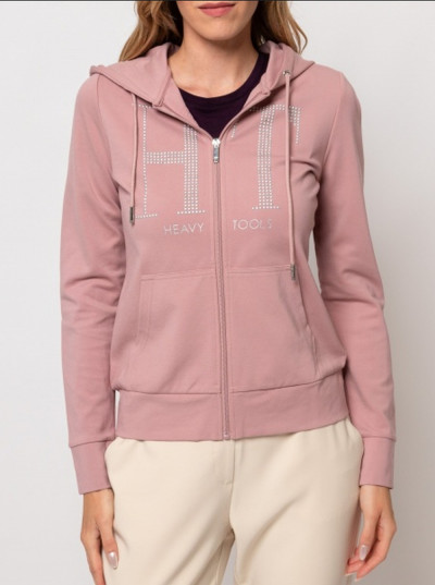 Heavy Tools női jogging felső, pasztel rózsaszín színben, elején cipzáras záródással, oldalzsebes és kapucnis, mell részén filmnyomott és kövekkel kirakott márkajelzéssel az őszi/téli Heavy Tools kollekcióból.