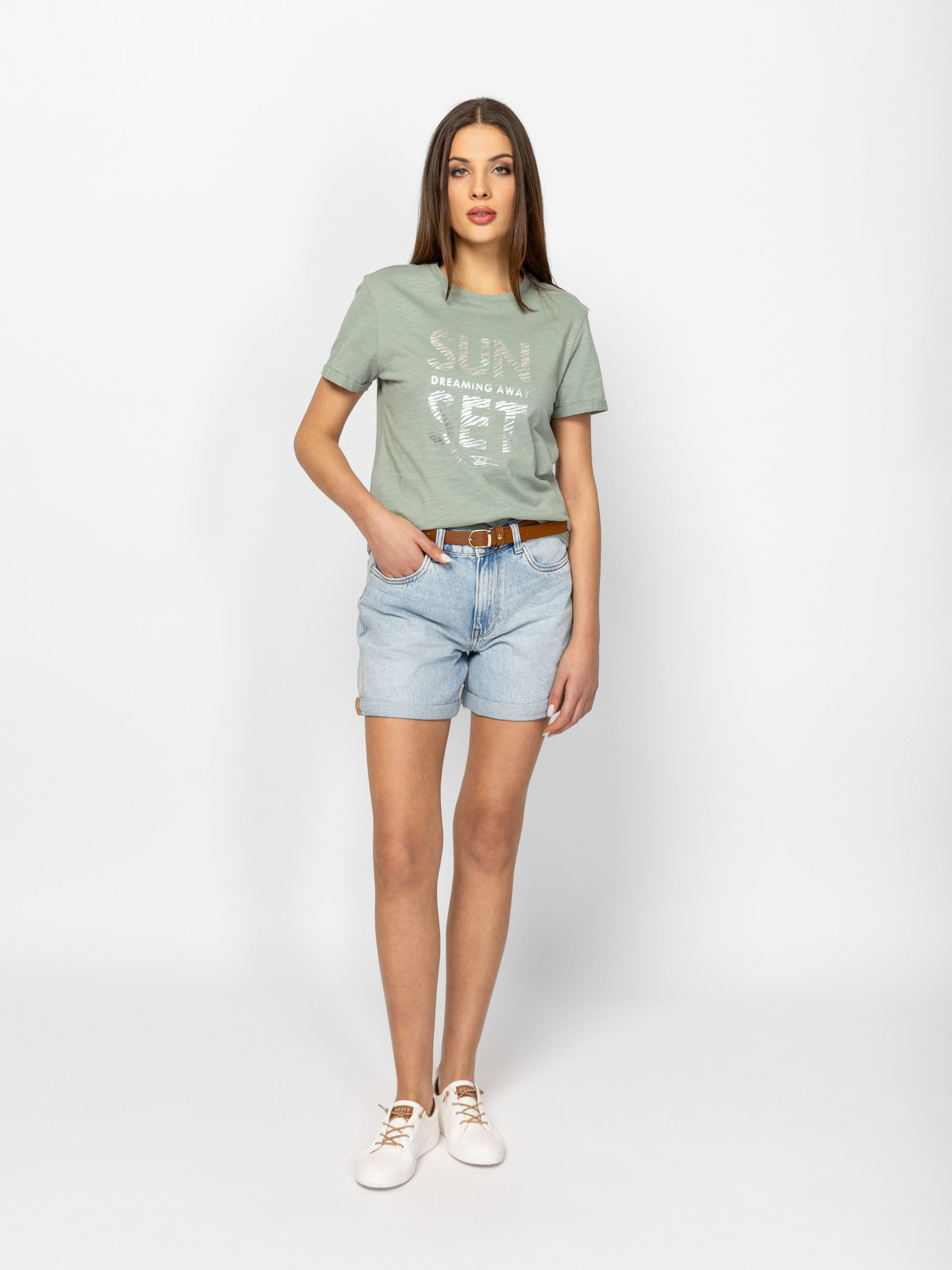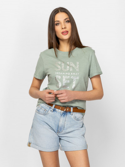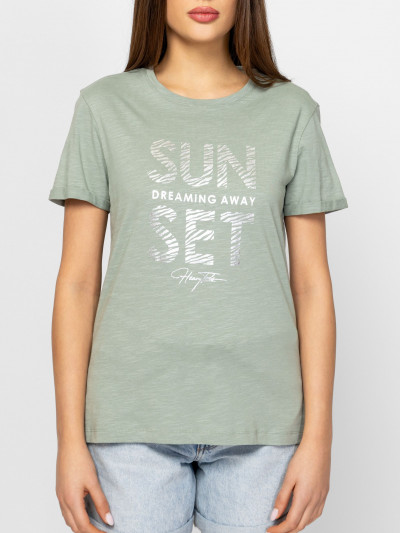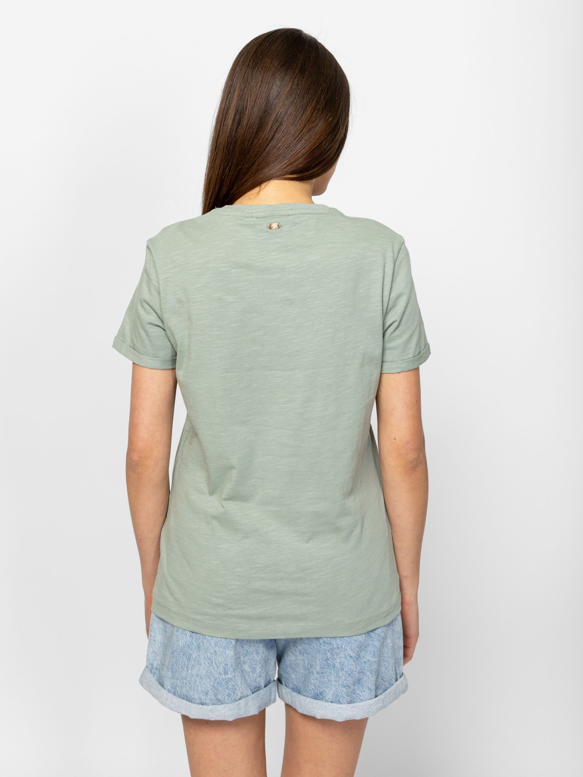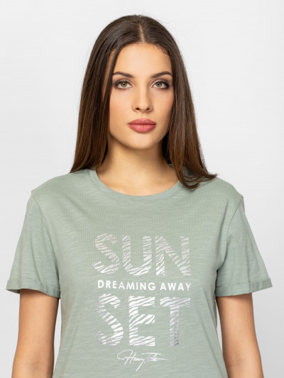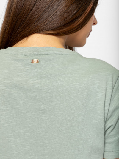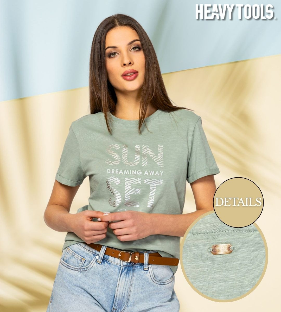 Heavy Tools női rövid ujjú póló, páfrányzöld színben, regular fit szabással, kerek nyakkal, hátán kisméretű-, elején filmnyomott felirattal és márkajelzéssel.