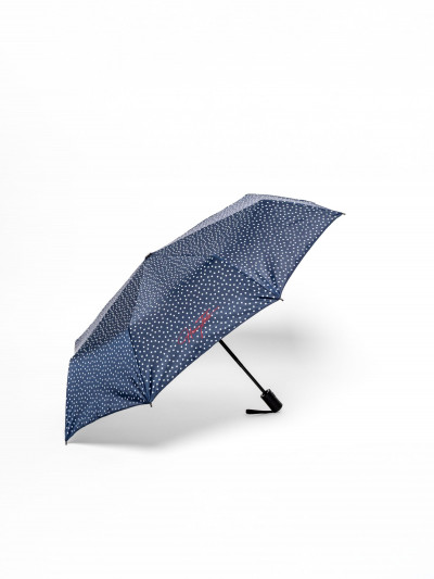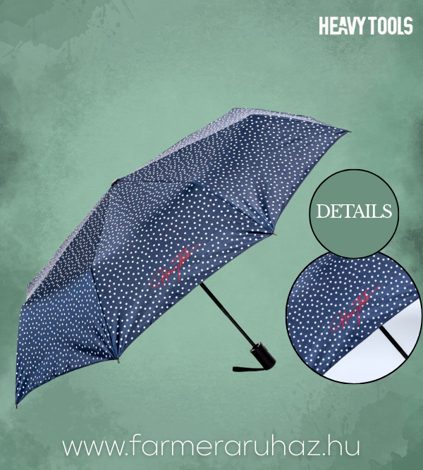 Heavy Tools automata esernyő, sötétkék színben, fehér színű pöttyös mintával, külső oldalán nyomott márkajelzéssel. Hozzá tartozó védőtasakkal.