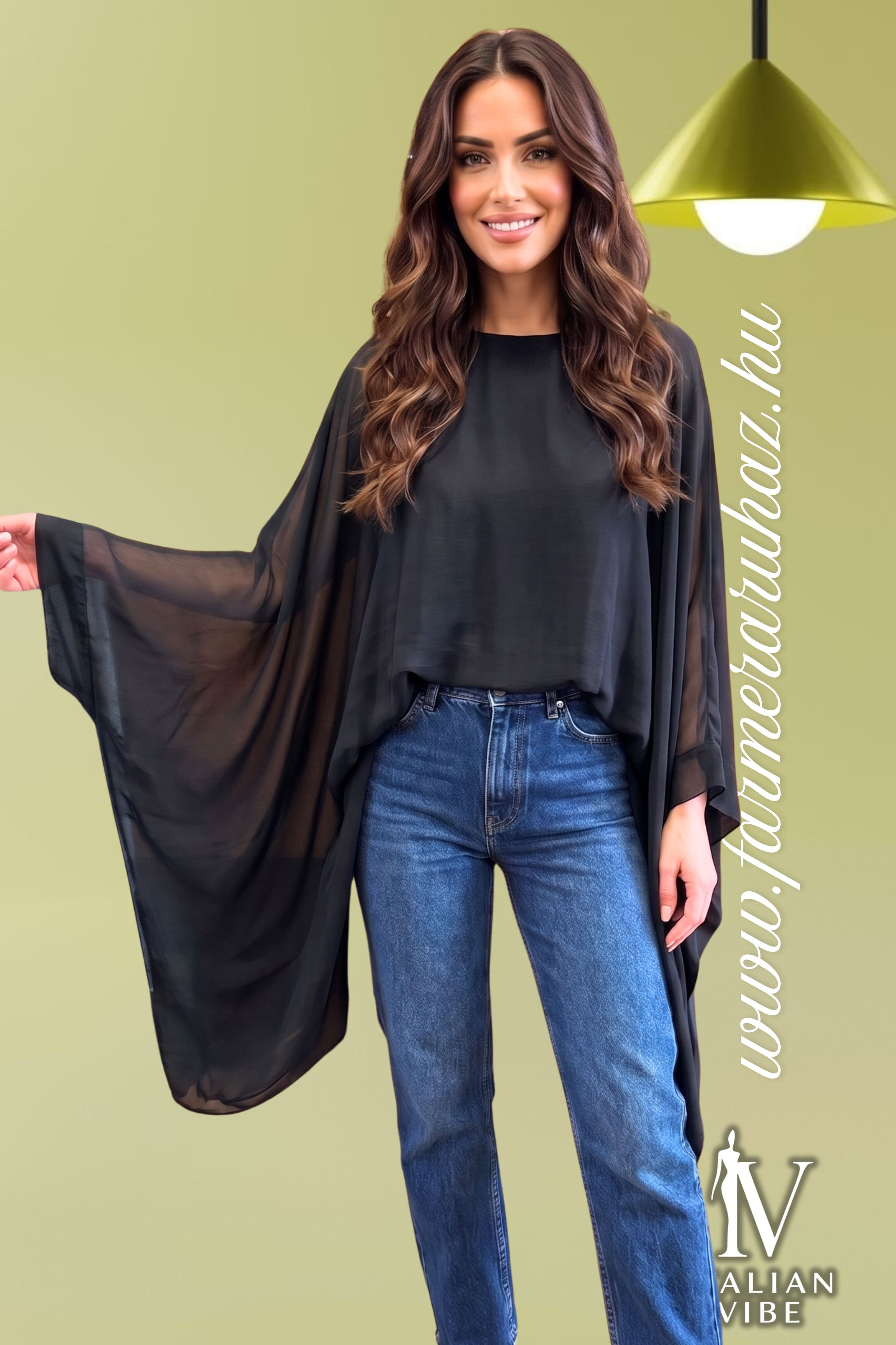 Italian Vibe női felső, fekete színben. Denevér ujjal, vékony áttetsző anyaggal, elején dupla réteggel, két oldalt hoszabb kialakítással.