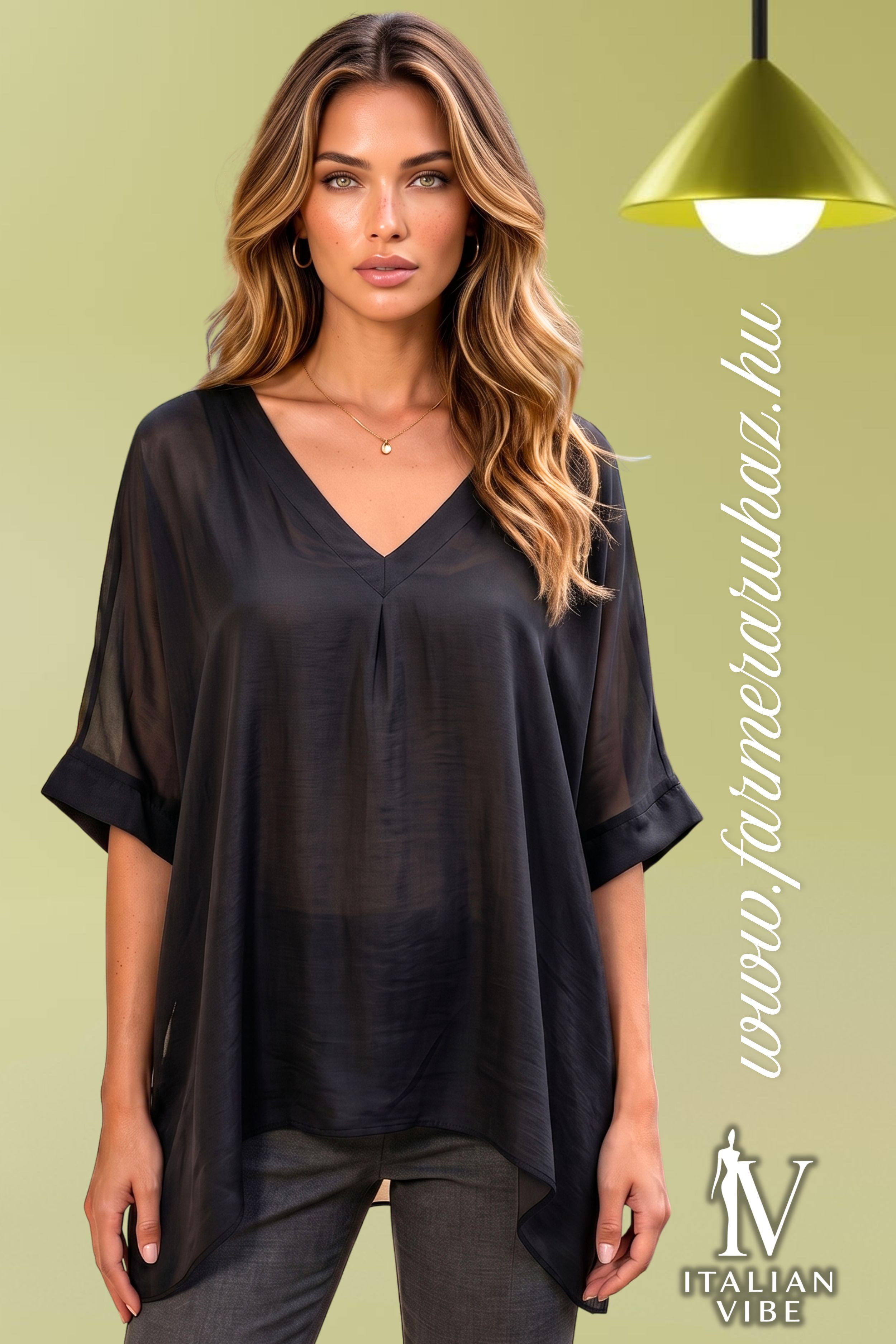 Italian Vibe női felső, fekete színben. Enyhe denevér ujjal, vékony áttetsző anyaggal, V nyakkivágással, elején dupla réteggel, két oldalt hoszabb kialakítással.