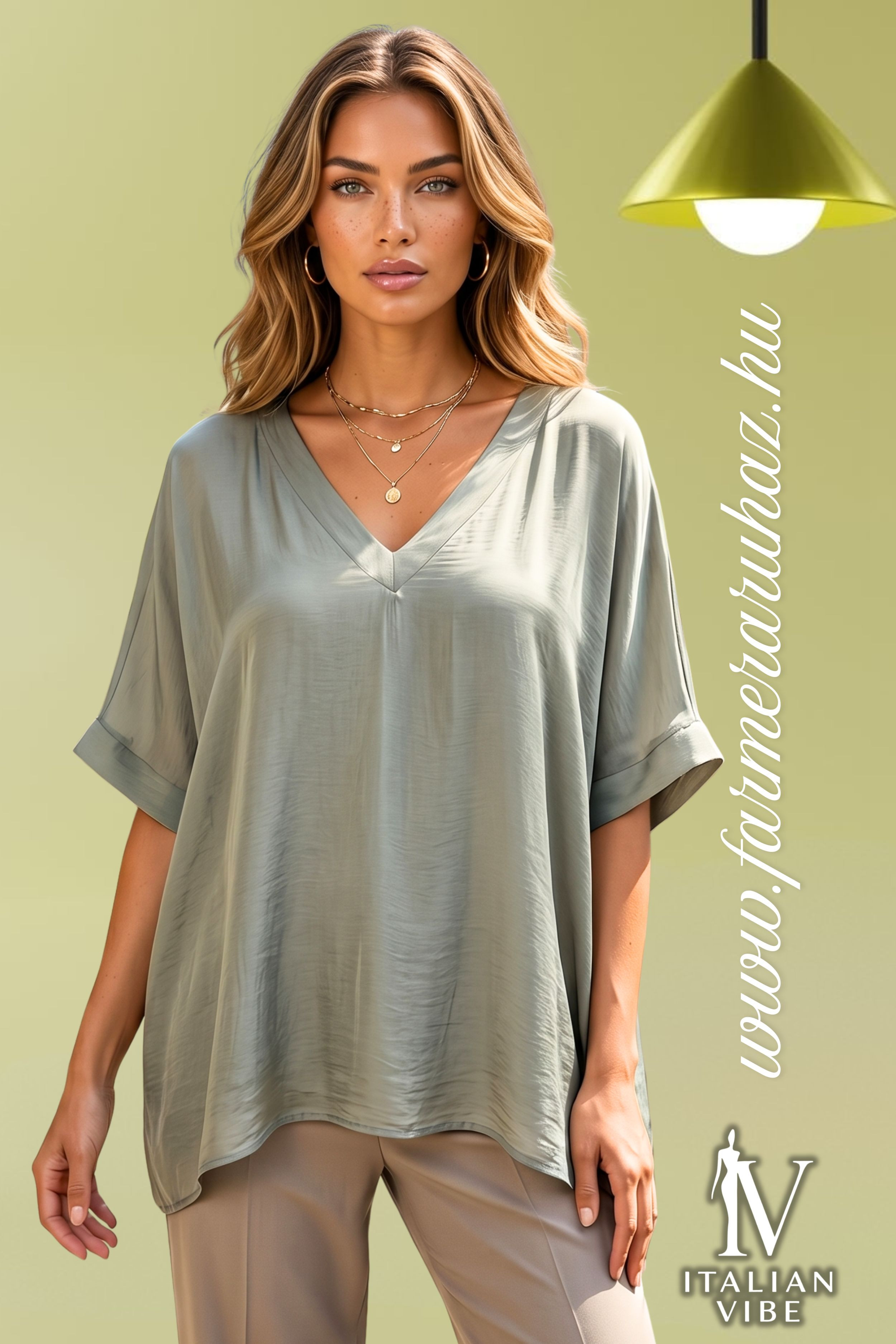 Italian Vibe női felső, khaki színben. Enyhe denevér ujjal, vékony áttetsző anyaggal, V nyakkivágással, elején dupla réteggel, két oldalt hoszabb kialakítással.