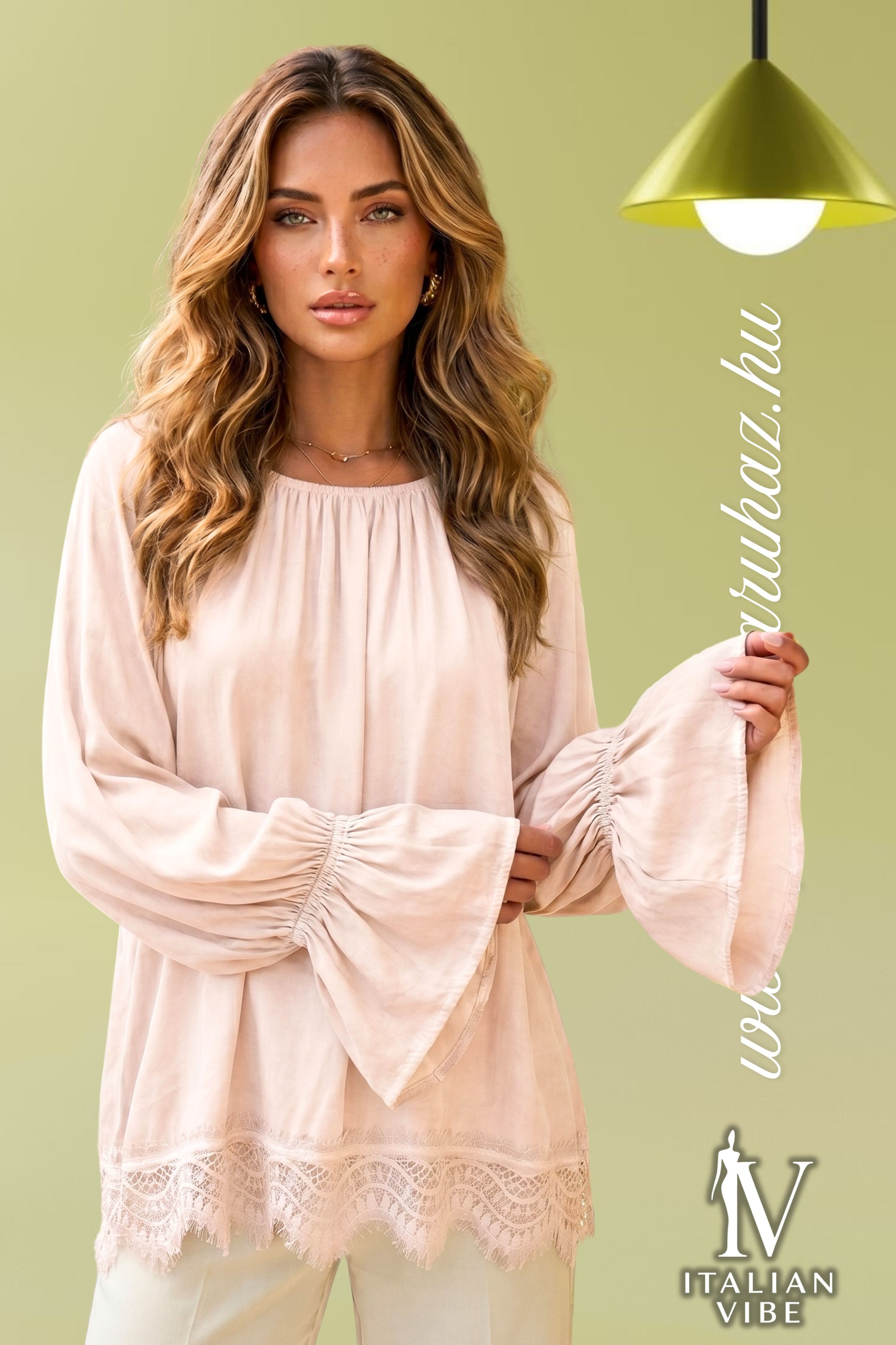 Italian Vibe szatén hatású női felső, púder színben. Gumis vállal, ujja gumis és harang végződésű, alján csipke díszítéssel.