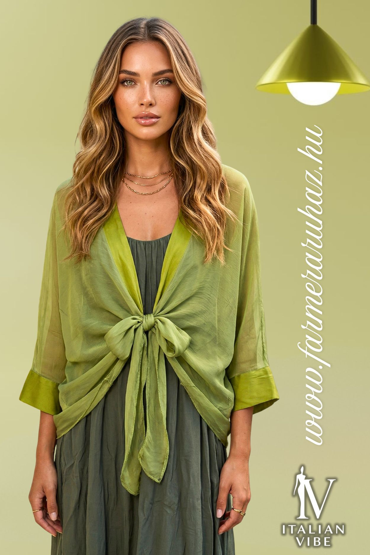 Italian Vibe női kardigán, zöld színben. lenge fazonban, vékony áttetsző anyaggal, elején lazán megköthető.