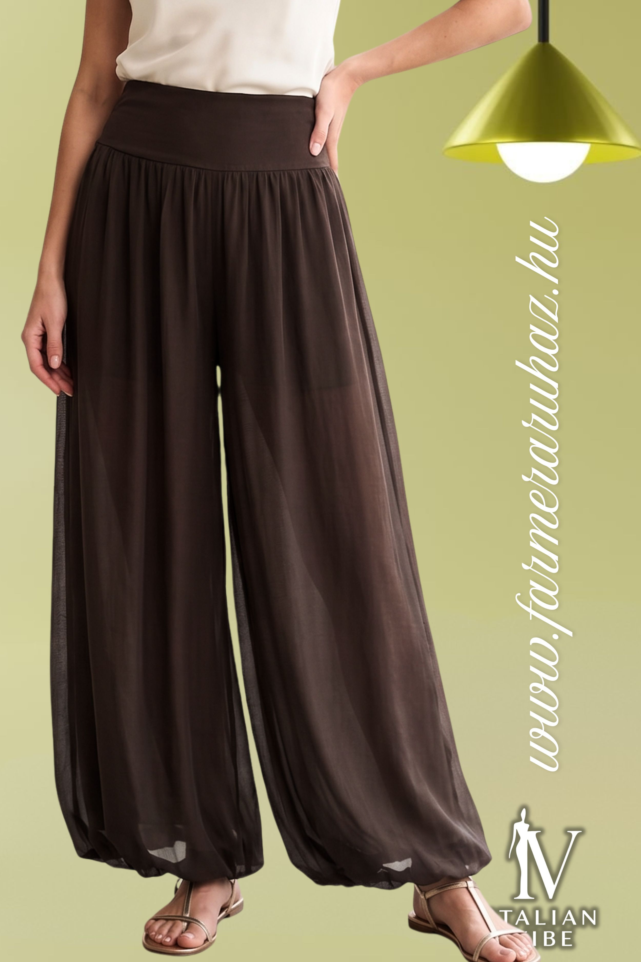 Italian Vibe női lenge, lehajtott derekú nadrág, csokoládé barna színben, elasztikus derékrésszel, szárán dupla anyaggal.