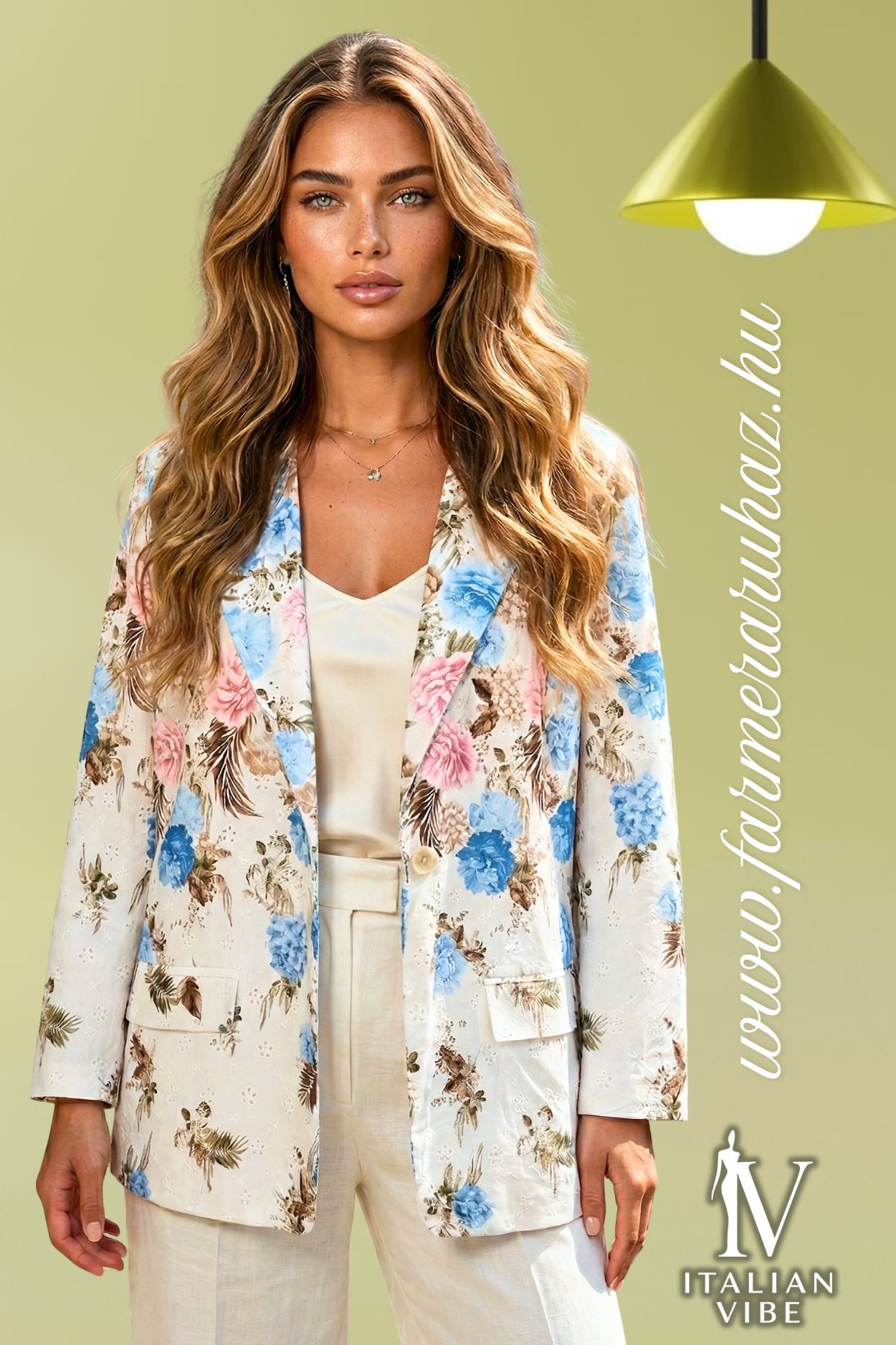 Italian Vibe női madeira zakó, ekrü színben színes virág mintával. Over size fazonban, elején egy gombos záródással és dísz zsebfedővel.
