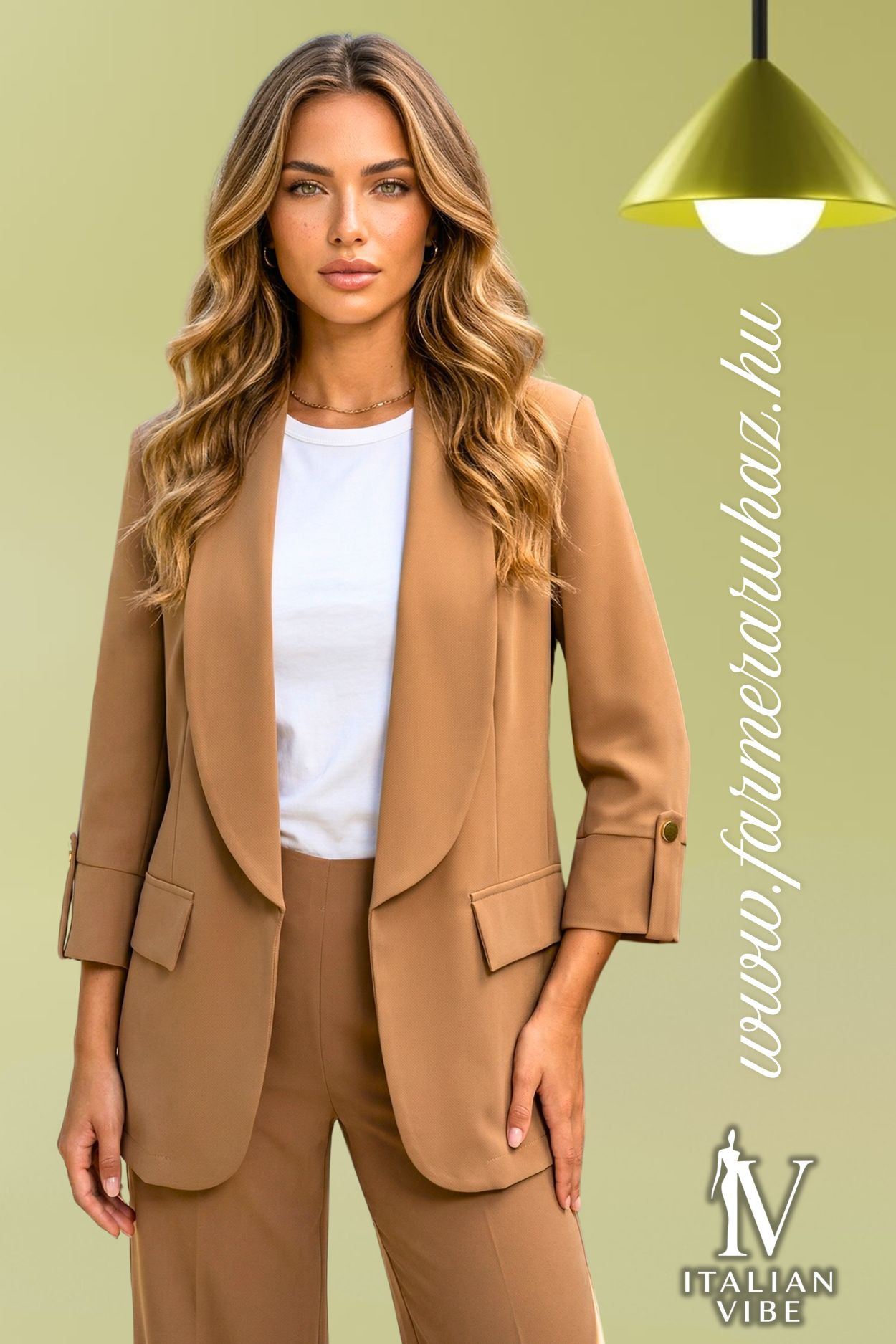 Italian Vibe laza fazonú női zakó, kakaóbarna színben, lazább fazonban. Eleje nyitott, ujján dísz felhajtással, elején dísz zsebfedőkkel.