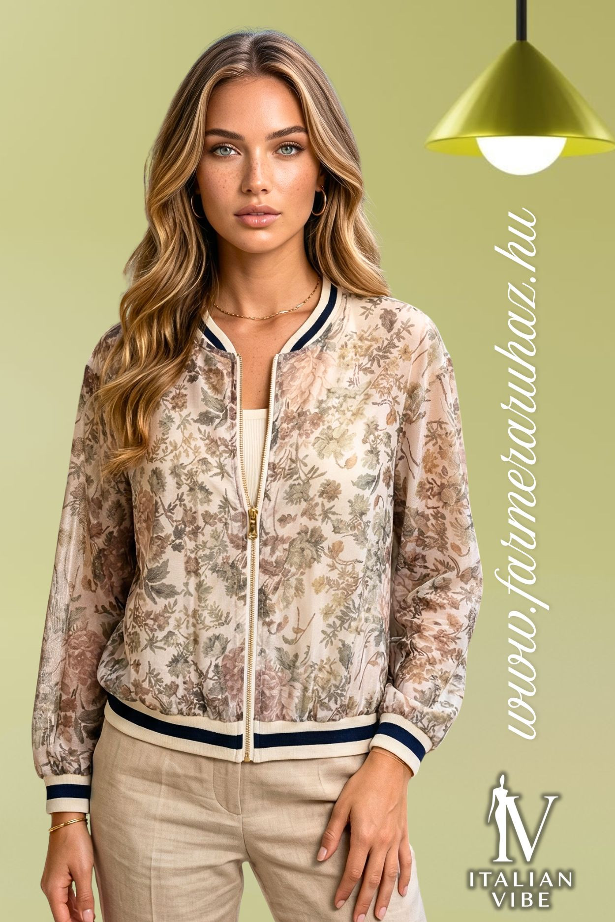 Italian Vibe női cipzáros, vékony, mintás felső, nyakánál, ujján és alján kötött anyaggal díszítve, lezser fazonban, kerek nyakkivágással.