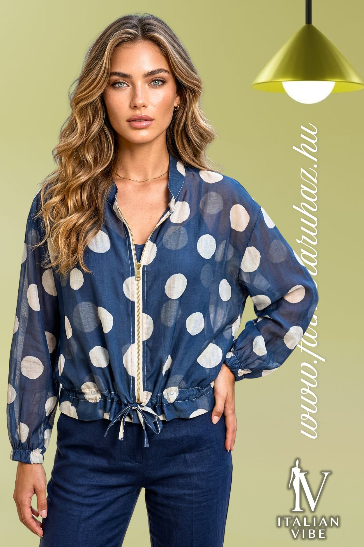 Italian Vibe női cipzáros, vékony felső, sötétkék színben, pöttyös mintával, lezser fazonban, kerek nyakkivágással, alja húzózsinórral szűkíthető.