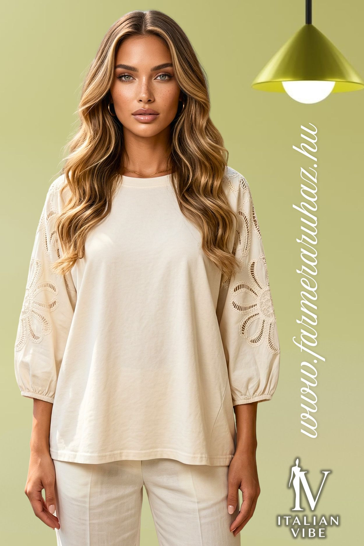 Italian Vibe női felső, buggyos ujjal, rajta horgolt díszítéssel, gumírozott ujjal, kerek nyakkivágással, bézs színben, laza fazonban.