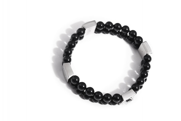 Cango&Rinaldi - Mozaik kollekciójában található gumi szálra fűzött karkötő fekete színű gyöngy és nikkel színű fémkellék kombinációjából; kétsoros fazonban; a fémkellékekbe fehér színű köves díszítéssel és gravírozott márkajelzéssel; mely jelöli a brand eredetiségét és minőségét!