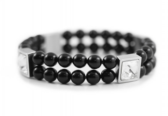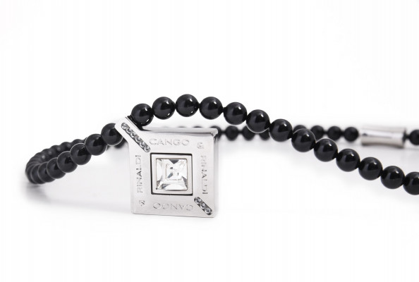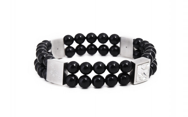 Cango&Rinaldi - Mozaik kollekciójában található gumi szálra fűzött karkötő fekete színű gyöngy és nikkel színű fémkellék kombinációjából; kétsoros fazonban; a fémkellékekbe fehér színű köves díszítéssel és gravírozott márkajelzéssel; mely jelöli a brand eredetiségét és minőségét!