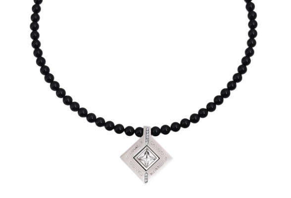 Cango&Rinaldi - Mozaik kollekciójában található nyaklánc fekete színű gyöngy és nikkel színű fémkellék kombinációjából; mágneses záródással; a fémkellékekbe fehér színű köves díszítéssel és gravírozott márkajelzéssel; mely jelöli a brand eredetiségét és minőségét!
