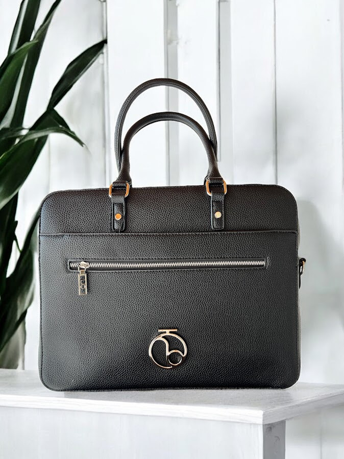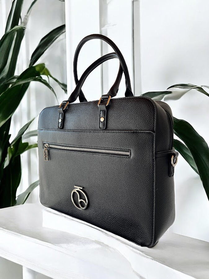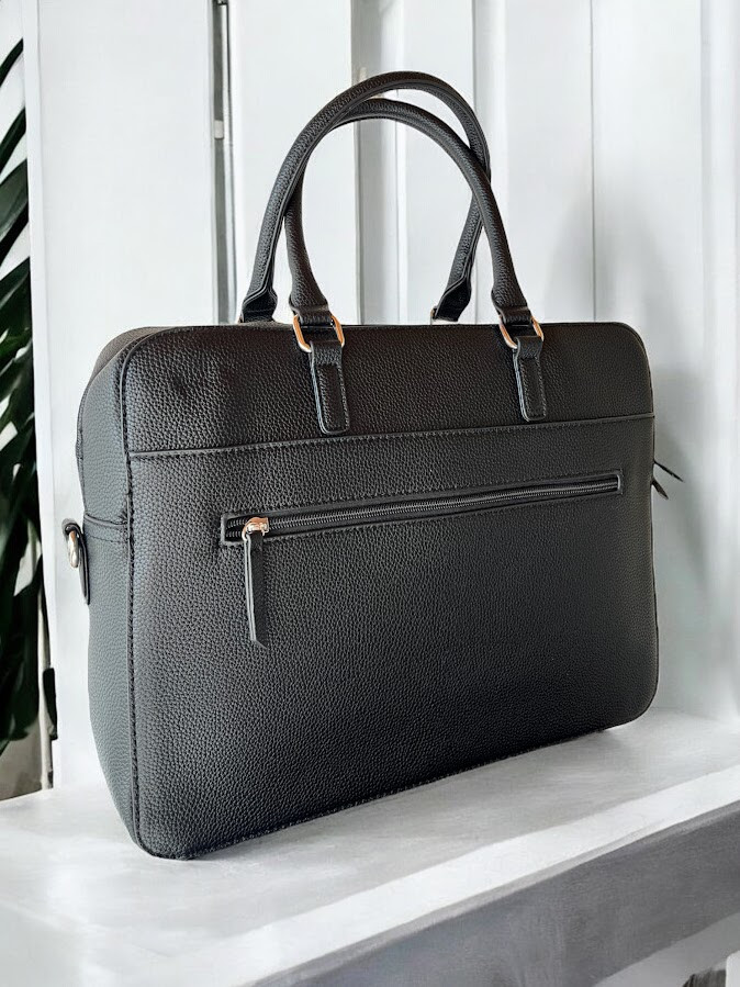 Nobo női laptop táska, bőrhatású anyagból, fekete színben, hozzátartozó állítható pántokkal, cipzáras záródással, belseje elválasztható egyterű rekesszel, benne egy zsebbel, elején cipzáras rekesszel, arany színű fém díszítéssel és márkajelzéssel.