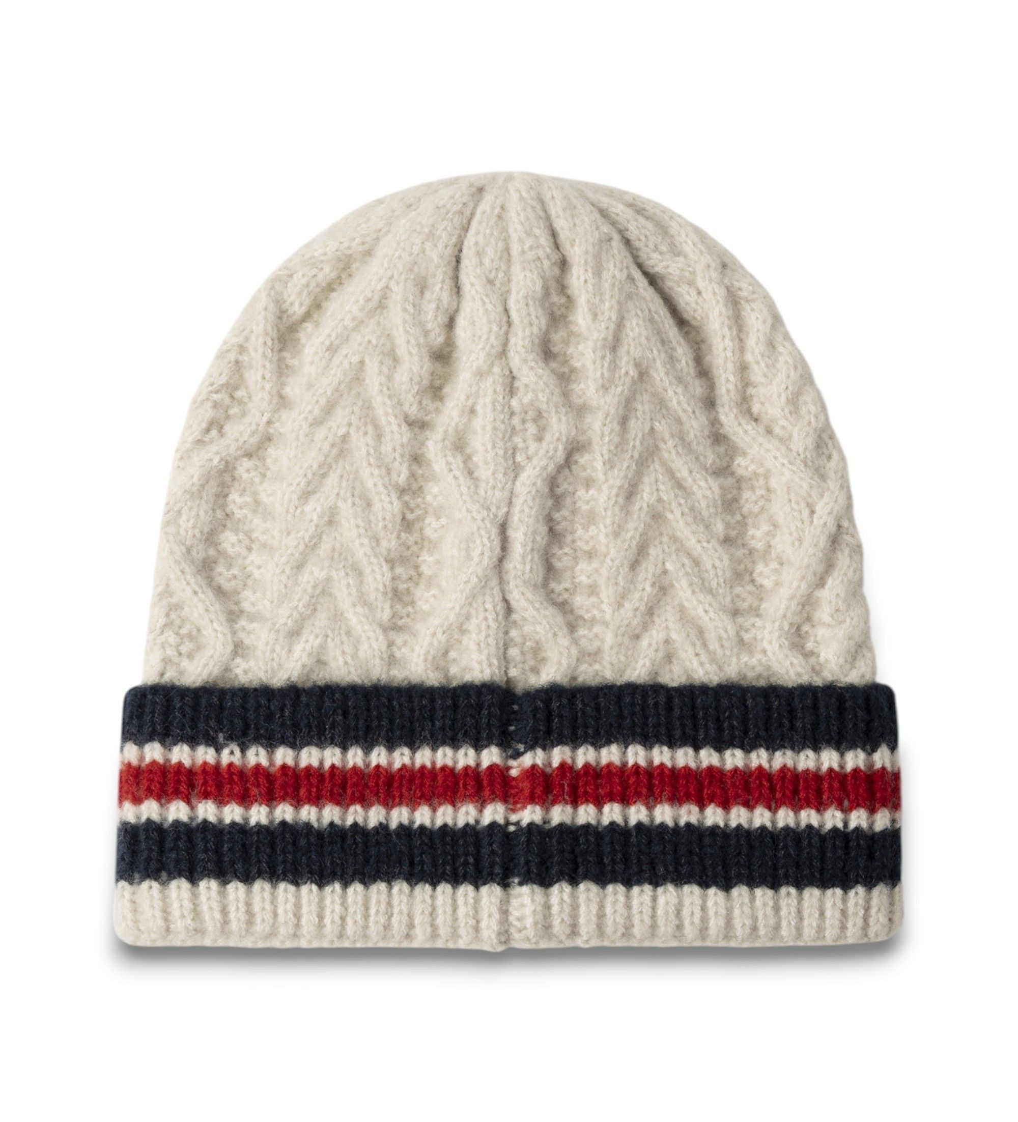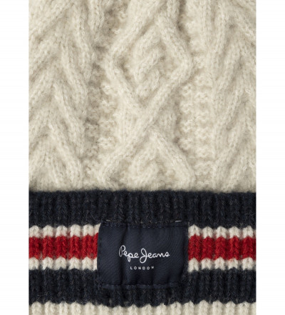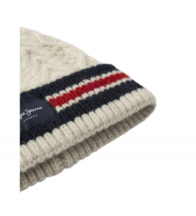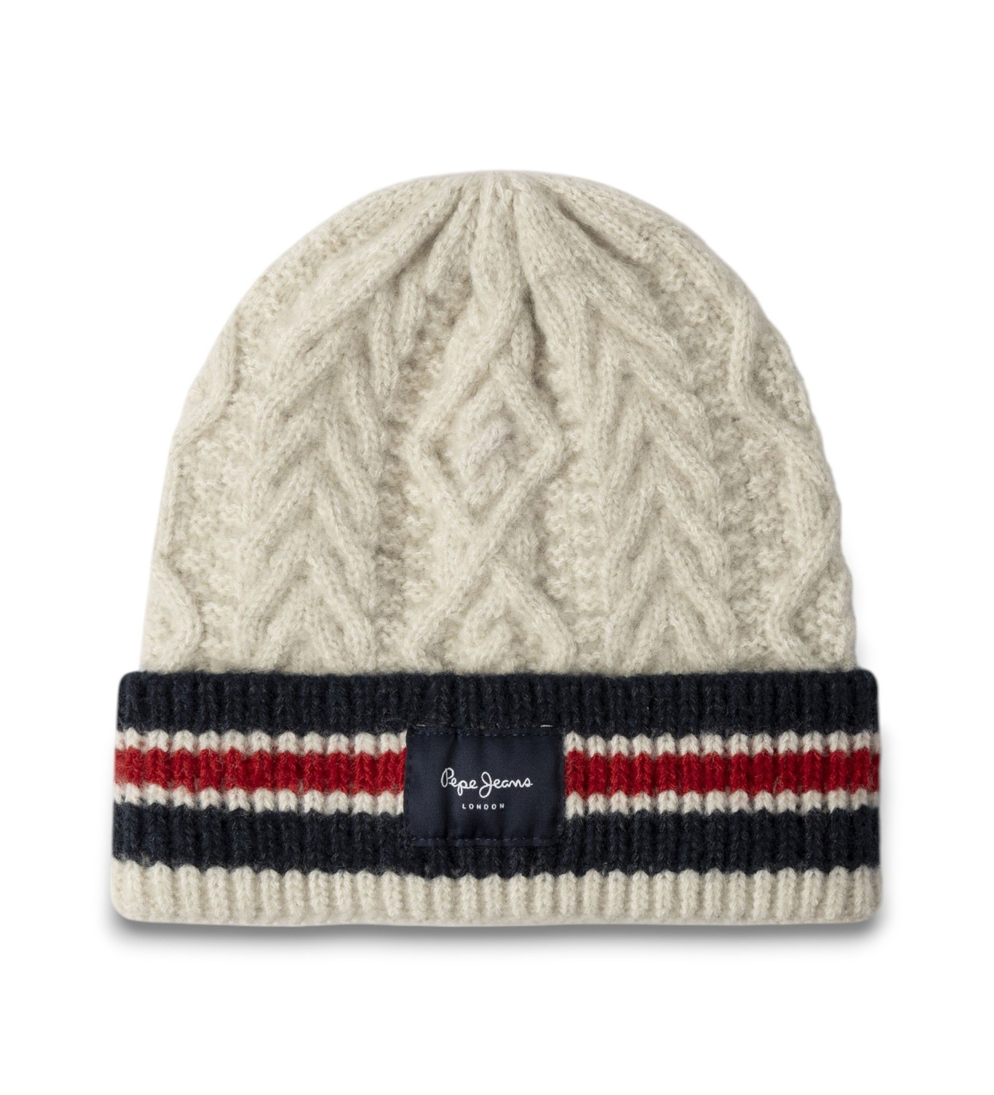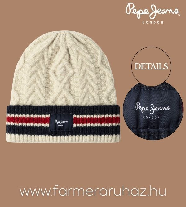 Pepe Jeans női kötött sapka, bézs, sötétkék és piros színkombinációban, elején rávarrt textil márkajelzéssel.