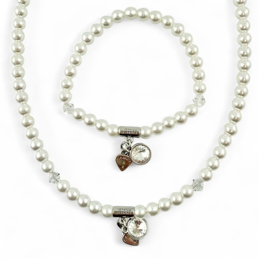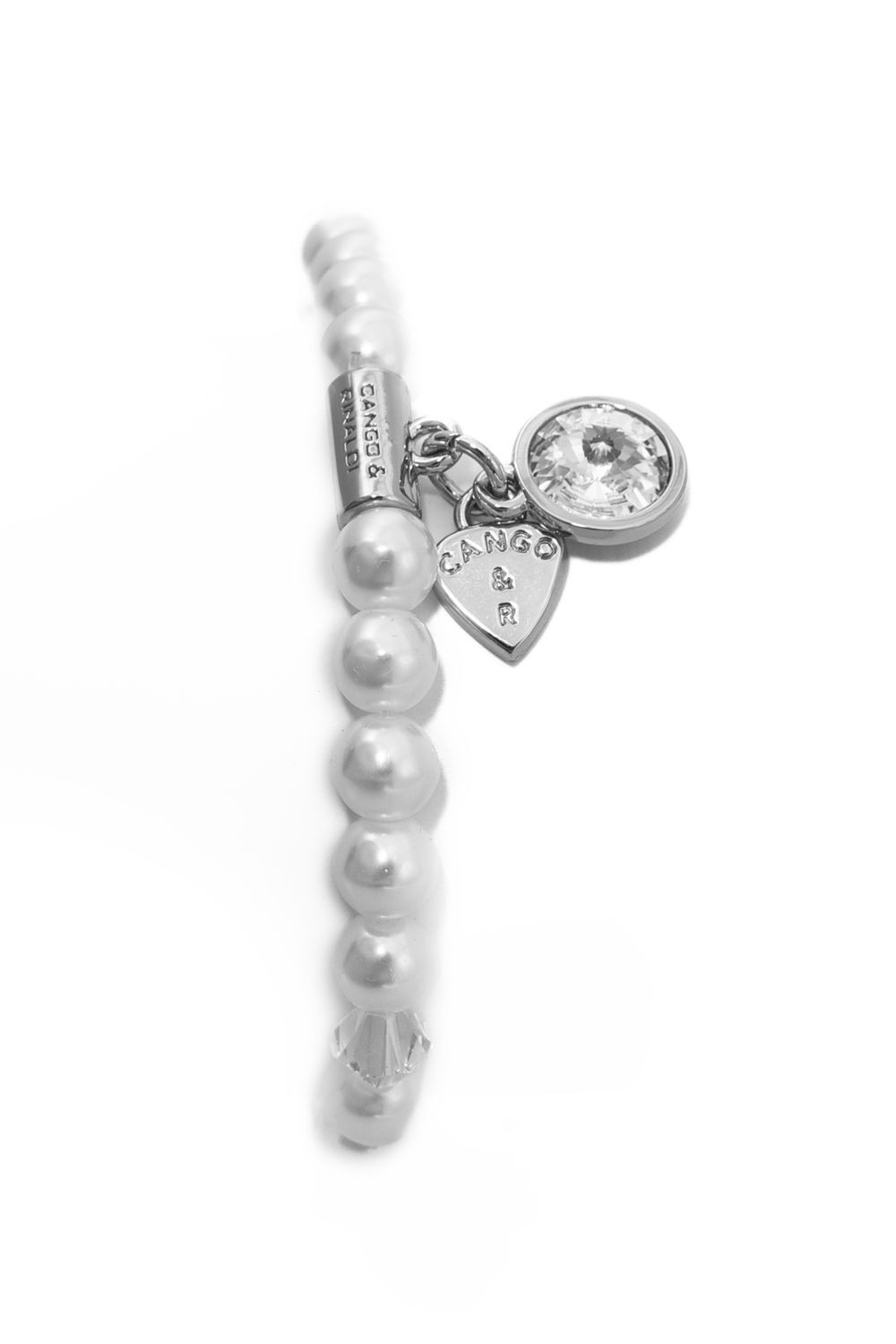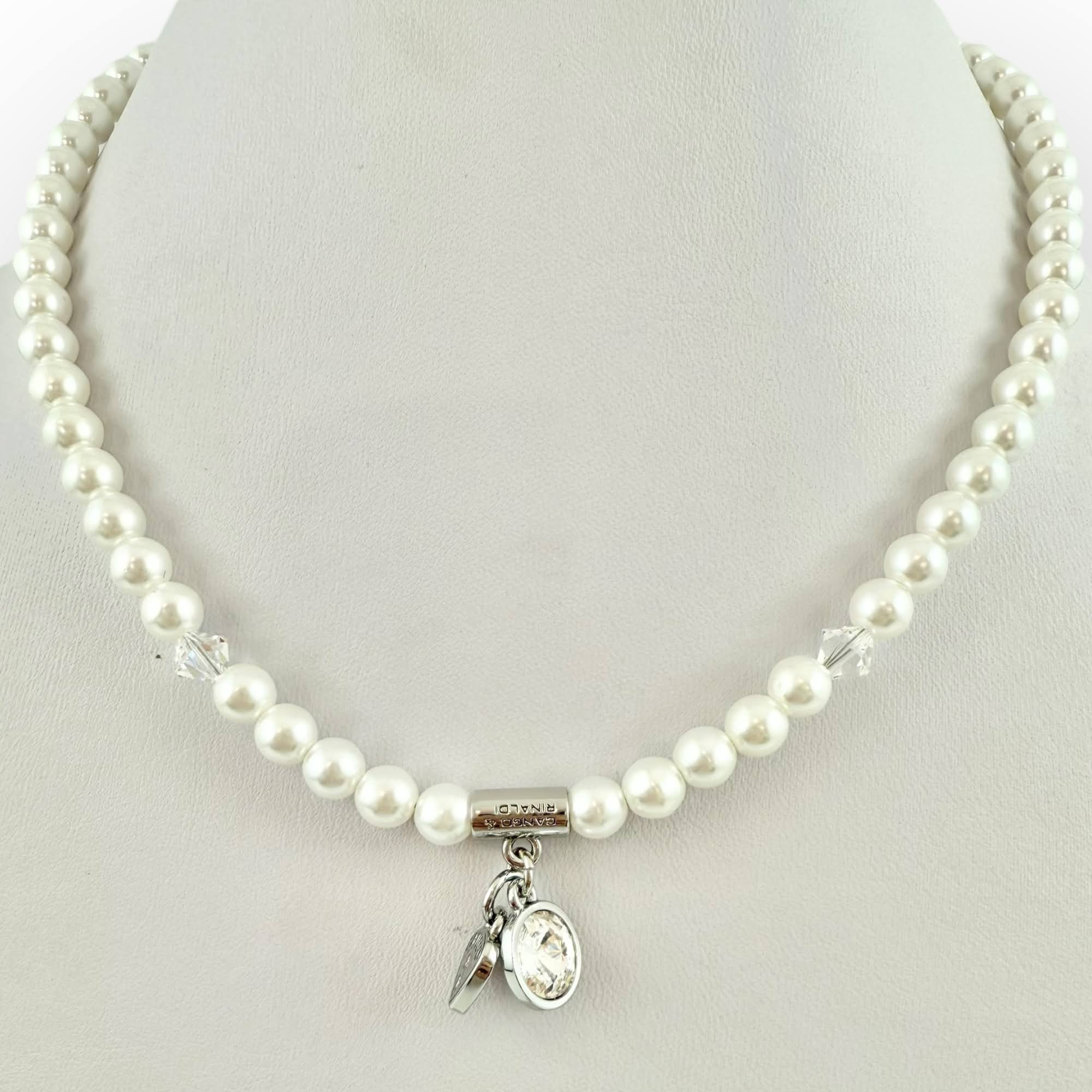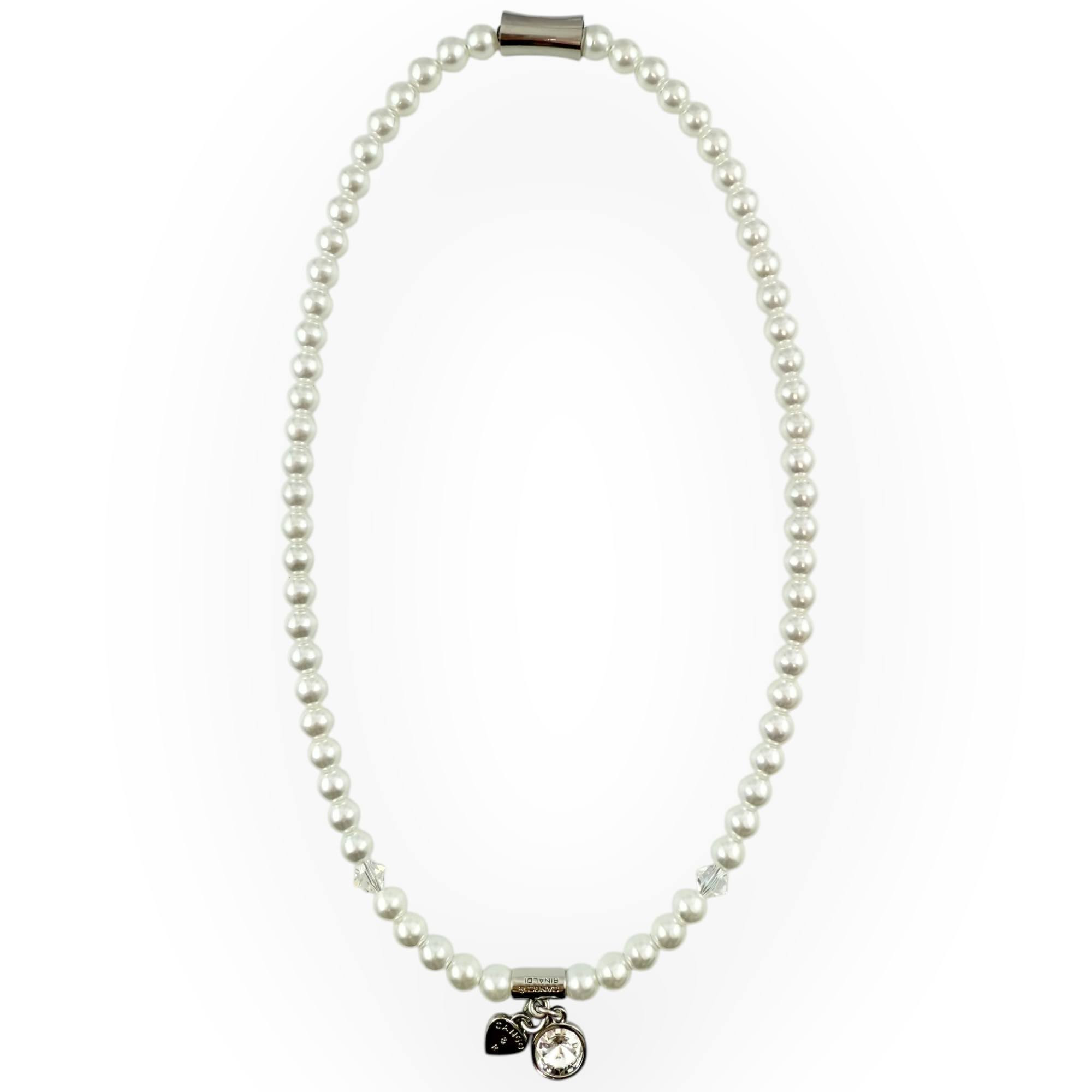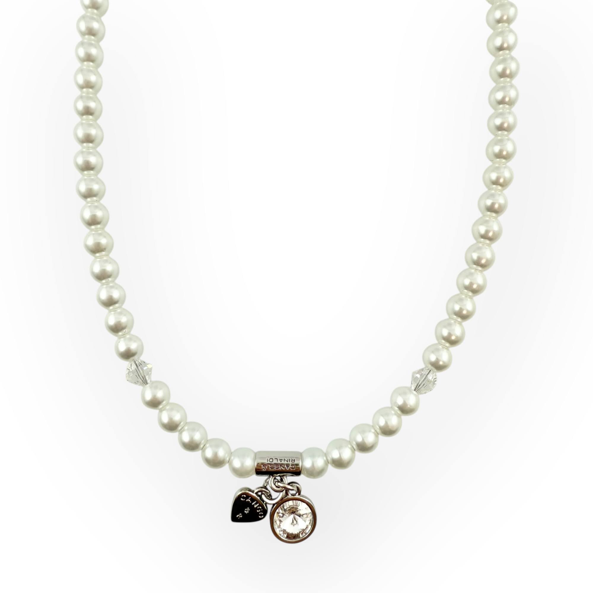 Cango&Rinaldi gyöngy karkötő; white színű gyöngy és fehér színű kristály kombinációjából készült egysoros fazonban; nikkel színű fém foglalattal, charm díszítéssel melyben egy különleges csiszolású, fehér színű kristály található. A fémkellékekbe gravírozott Cango&Rinaldi felirat jelöli a brand eredetiségét és minőségét!