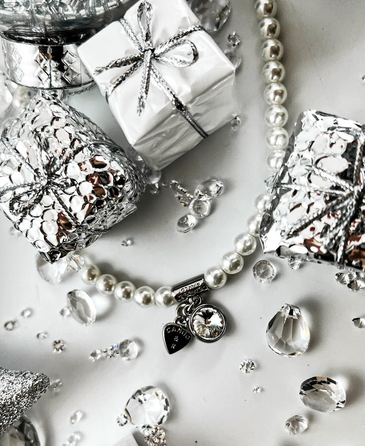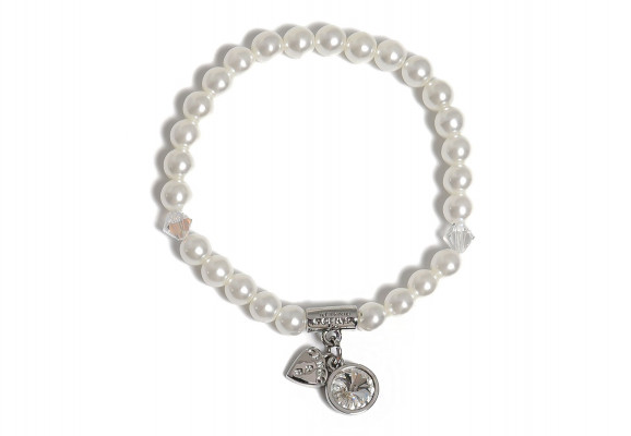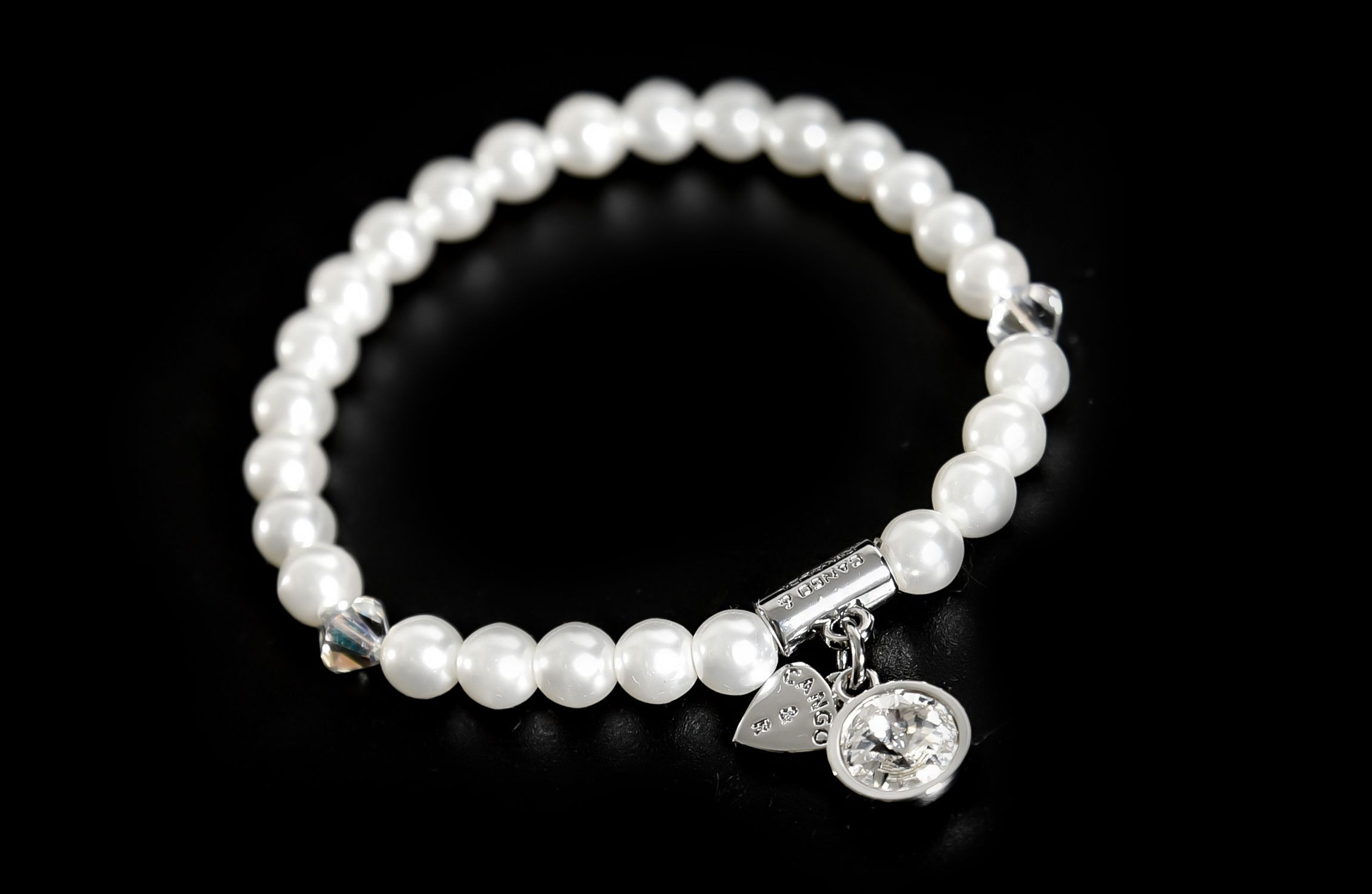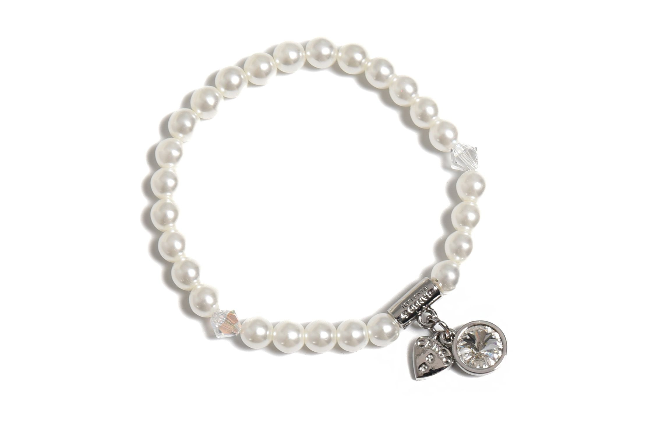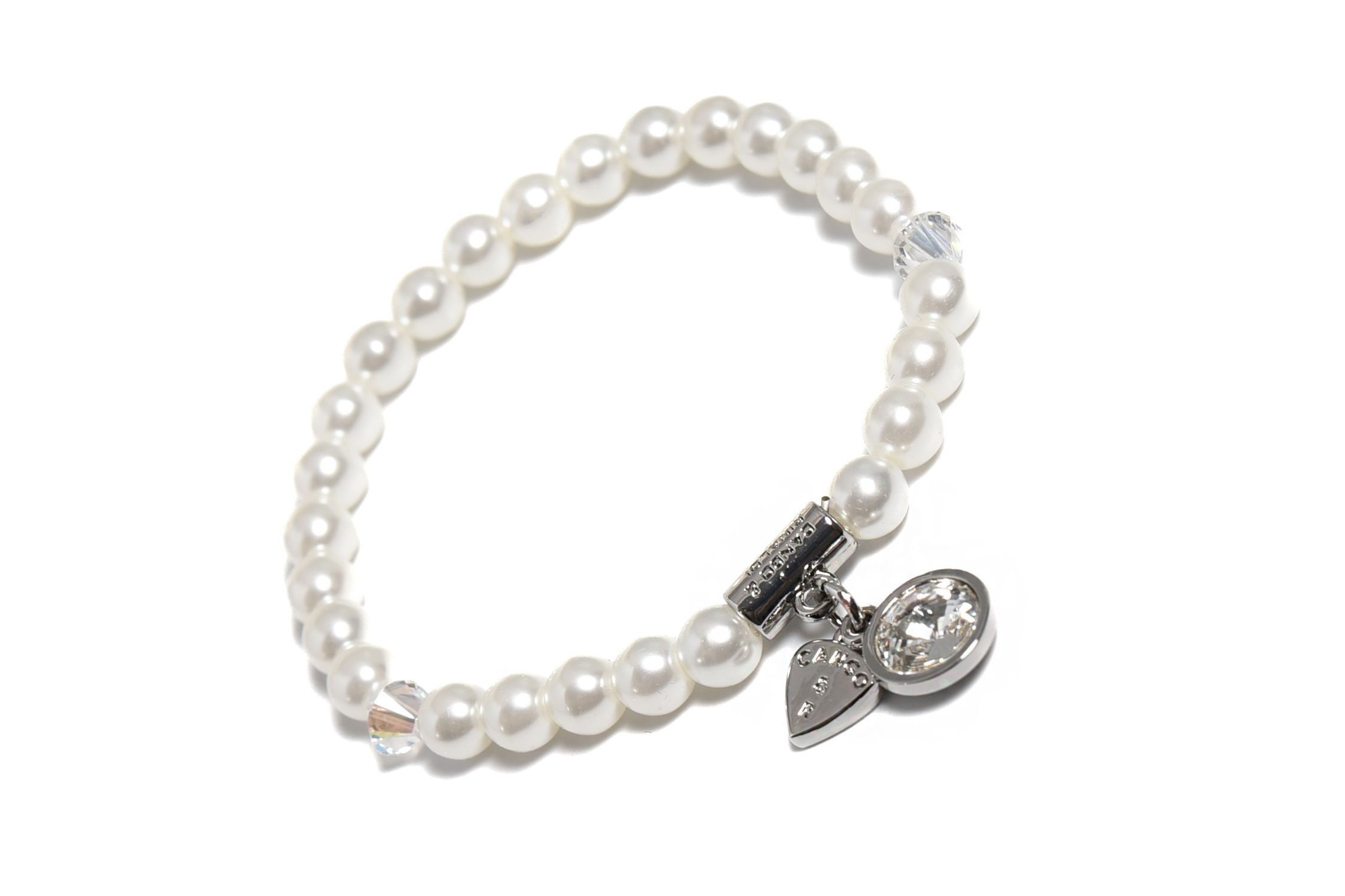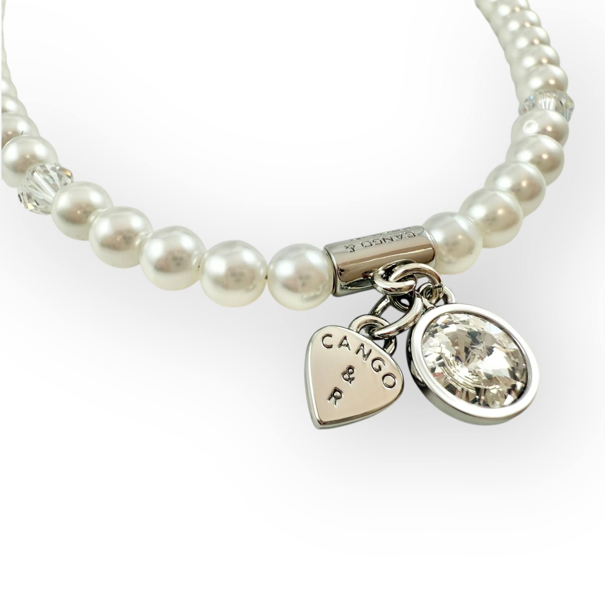 Cango&Rinaldi gyöngy karkötő; white színű gyöngy és fehér színű kristály kombinációjából készült egysoros fazonban; nikkel színű fém foglalattal, charm díszítéssel melyben egy különleges csiszolású, fehér színű kristály található. A fémkellékekbe gravírozott Cango&Rinaldi felirat jelöli a brand eredetiségét és minőségét!