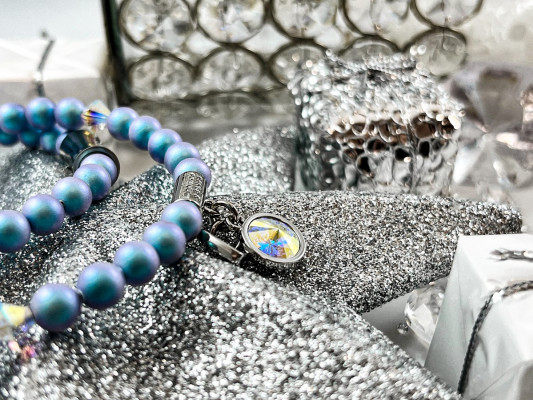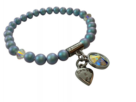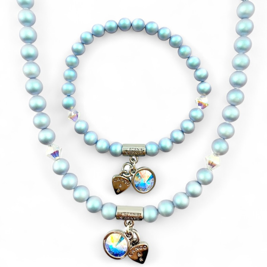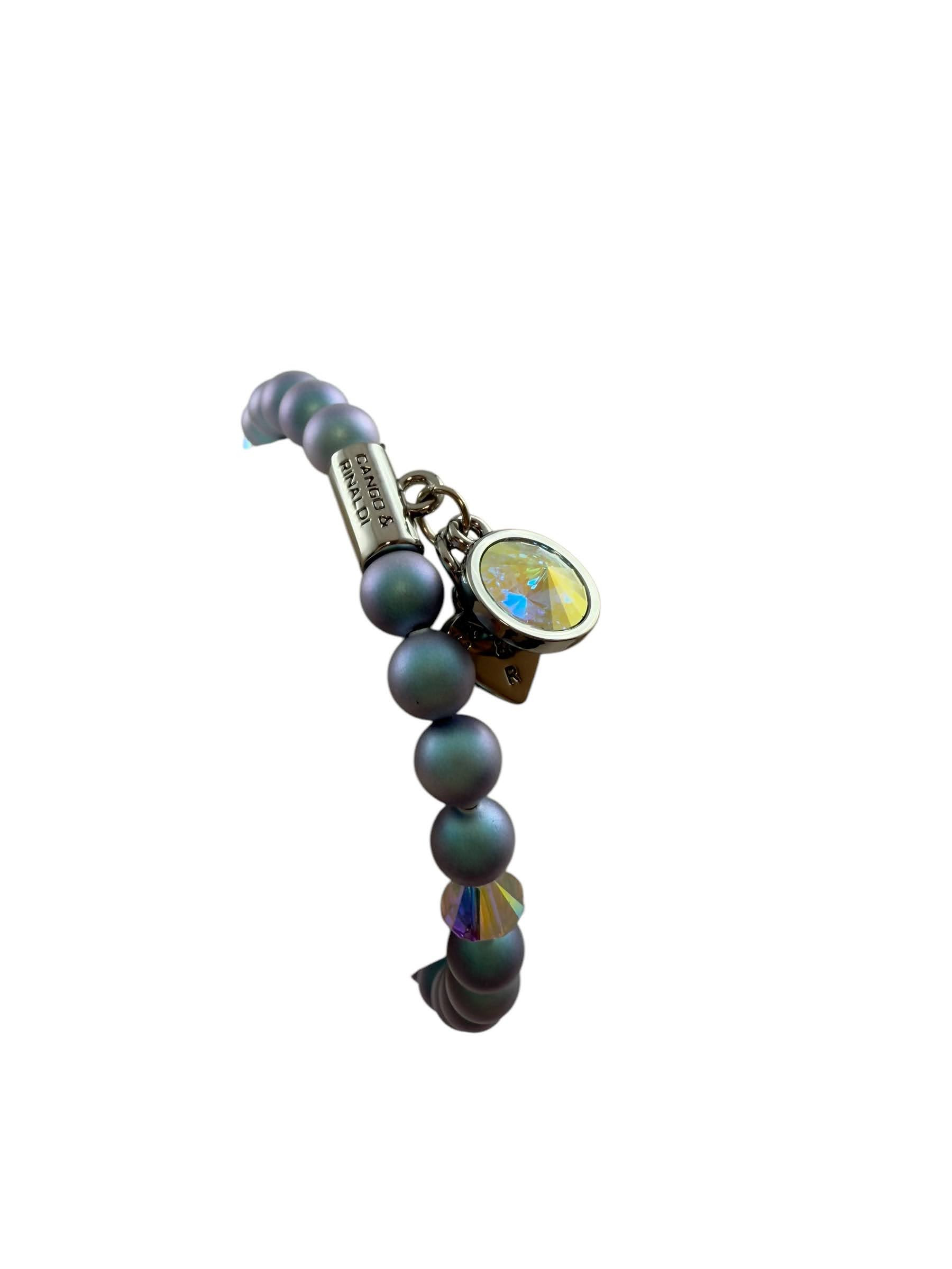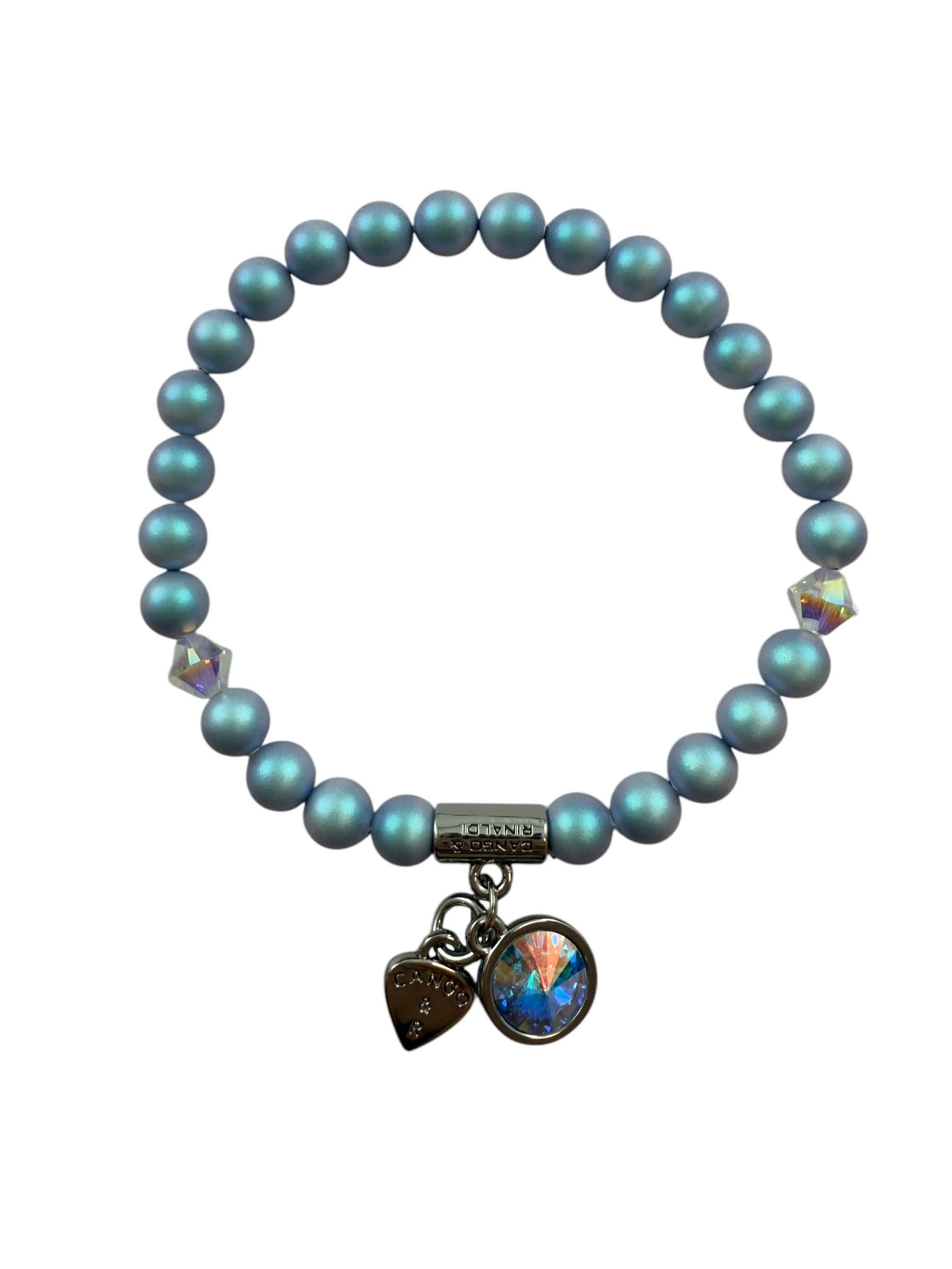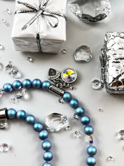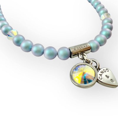 Cango&Rinaldi gyöngy karkötő, iridescent light blue színű gyöngy és színváltós színű kristály kombinációjából készült egysoros fazonban, nikkel színű fém foglalattal, charm díszítéssel melyben egy különleges csiszolású, színváltós színű kristály található. A fémkellékekbe gravírozott Cango&Rinaldi felirat jelöli a brand eredetiségét és minőségét!