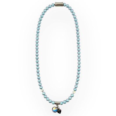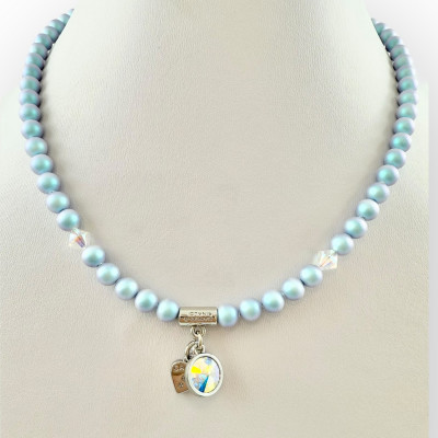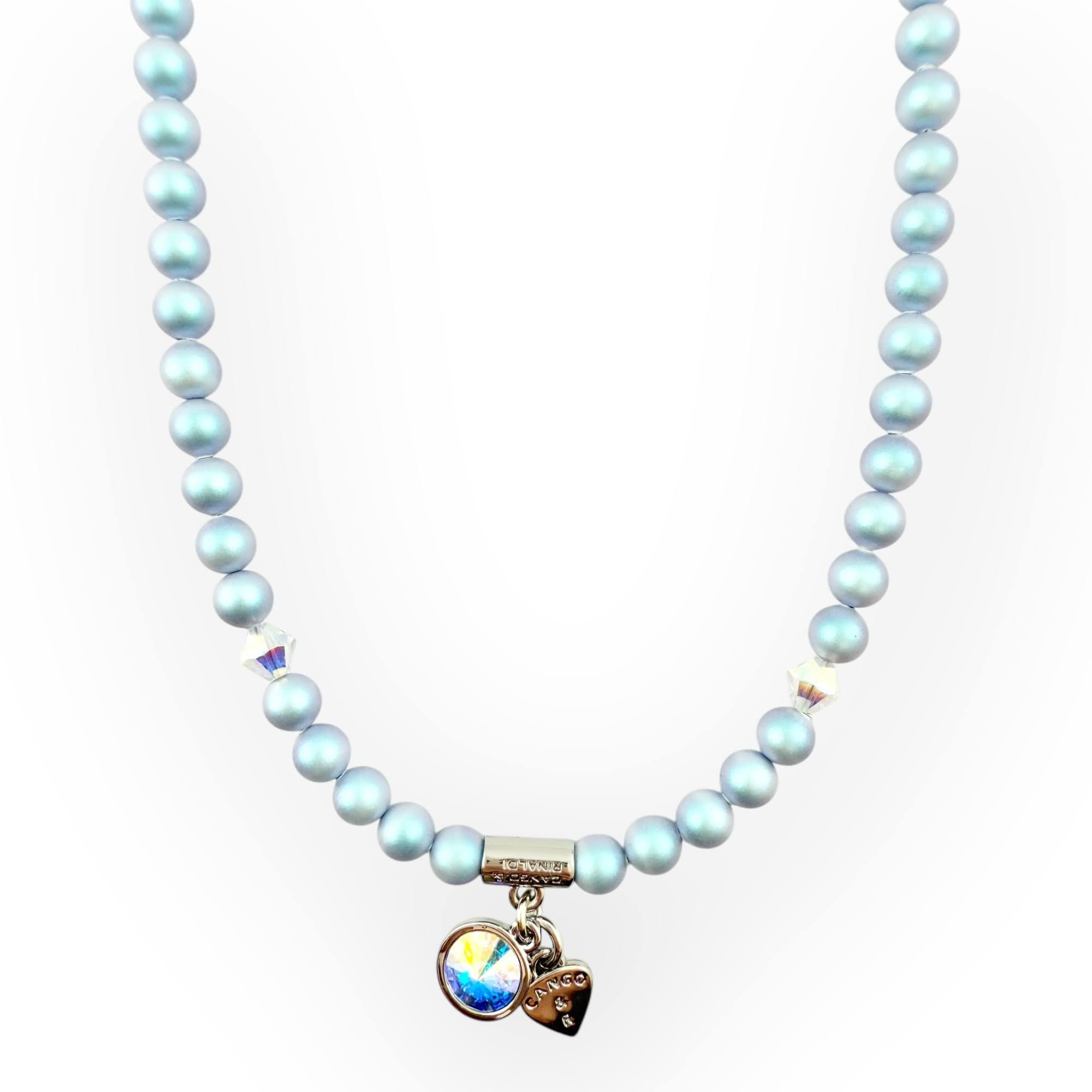 Cango&Rinaldi egysoros gyöngy nyaklánc, iridescent light blue színű gyöngy és színváltós színű kristály kombinációjából, charm díszítéssel melyben egy különleges csiszolású, színváltós színű kristály található, a nyaklánc nikkel színű fémkellékkel készült. A fémkellékekbe gravírozott Cango&Rinaldi, Cango&R, és C&R feliratok jelölik a brand eredetiségét és minőségét!