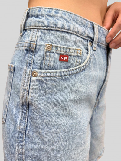 RetroJeans női Regular fit - high waist fazonú farmernadrág mosott hatású világoskék színben. Klasszikus öt zsebes, övbújtatós és gombos derékkal, cipzáras sliccel, rojtolt és szaggatott szárral, zsebénél és derekán márkajelzéssel.
