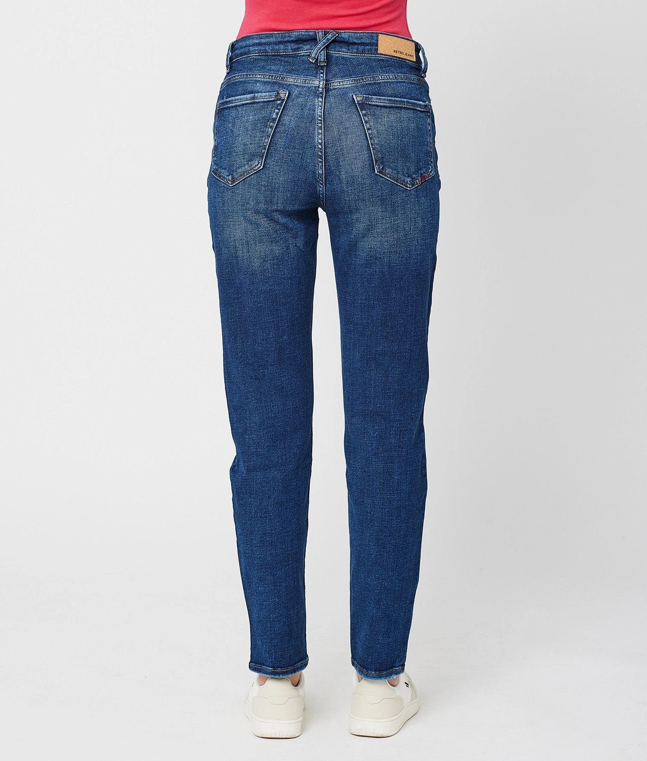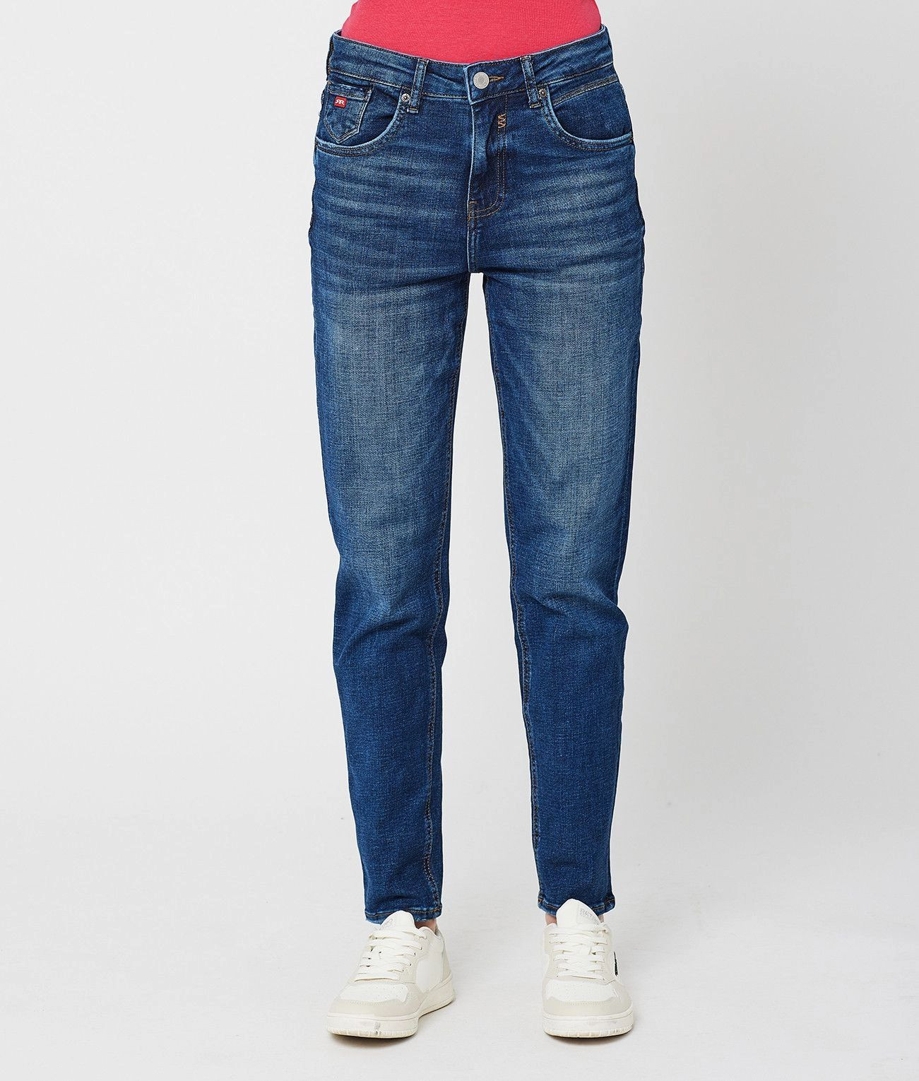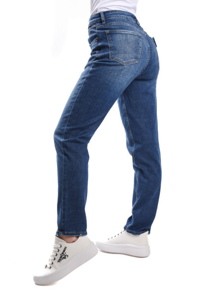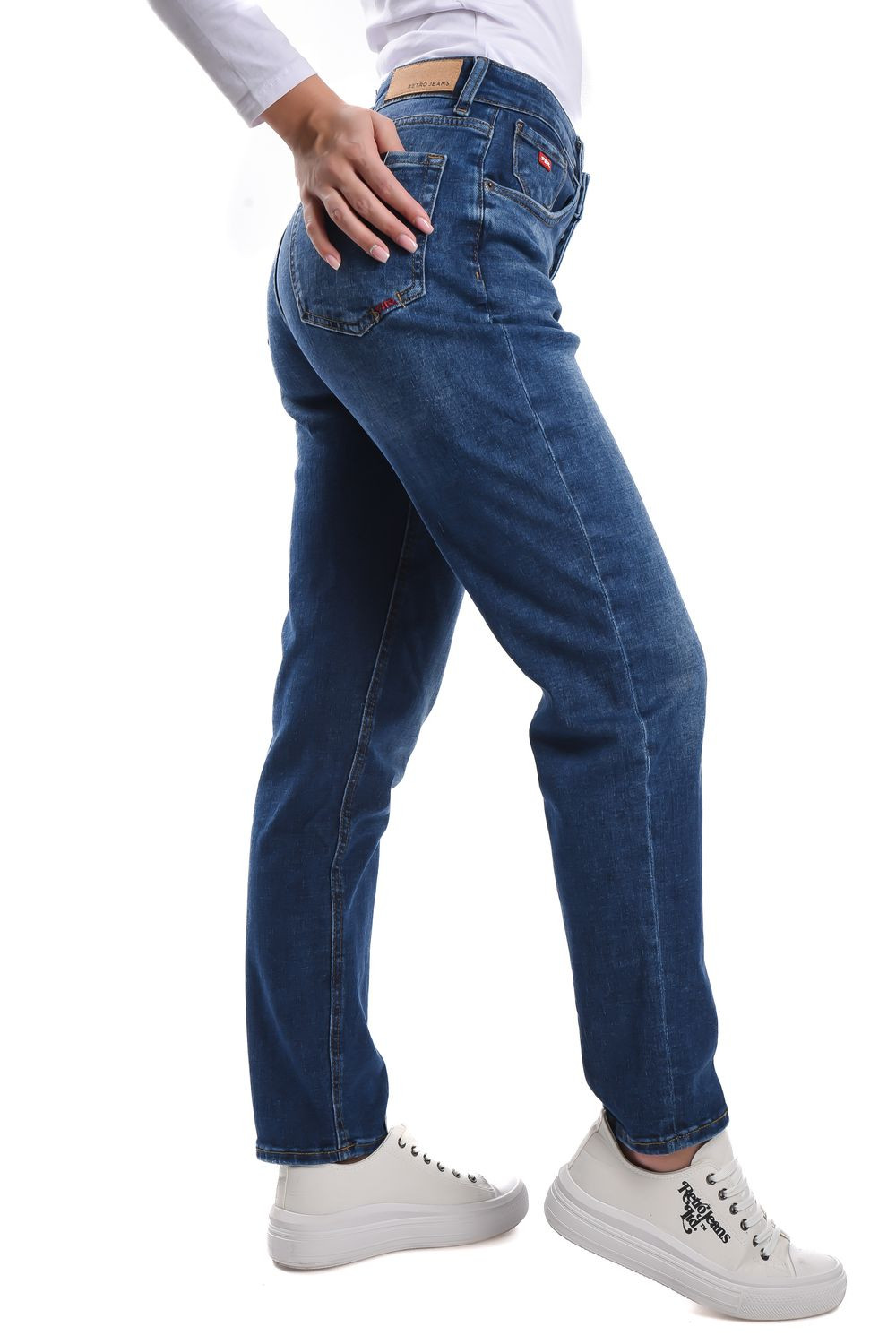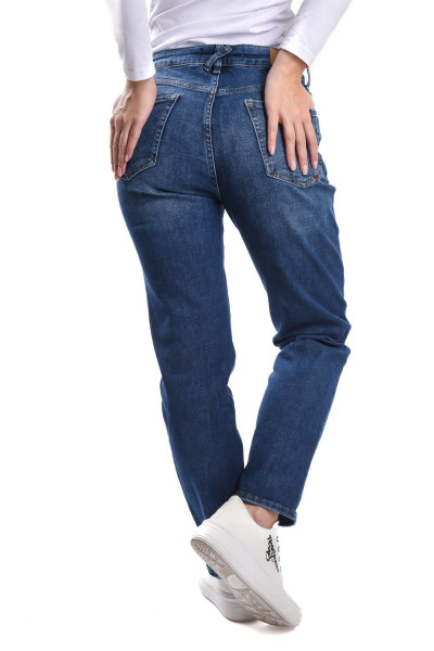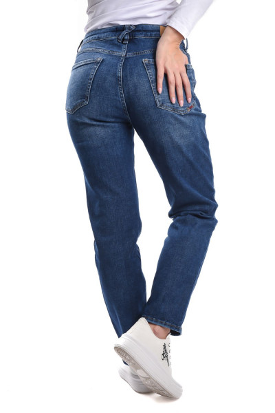 RetroJeans boyfriend fazonú női farmernadrág, sötét farmerkék színben, gombos és cipzáras záródással, koptatott, övbújtatós derékrésszel, klasszikus ötzsebes, derekán rávarrt- zsebén fém márkajelzéssel.