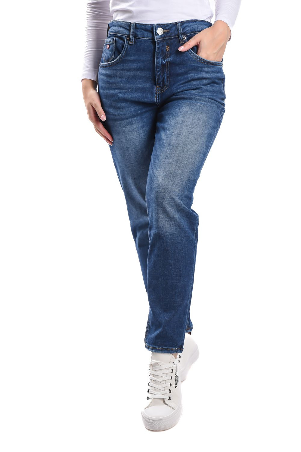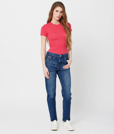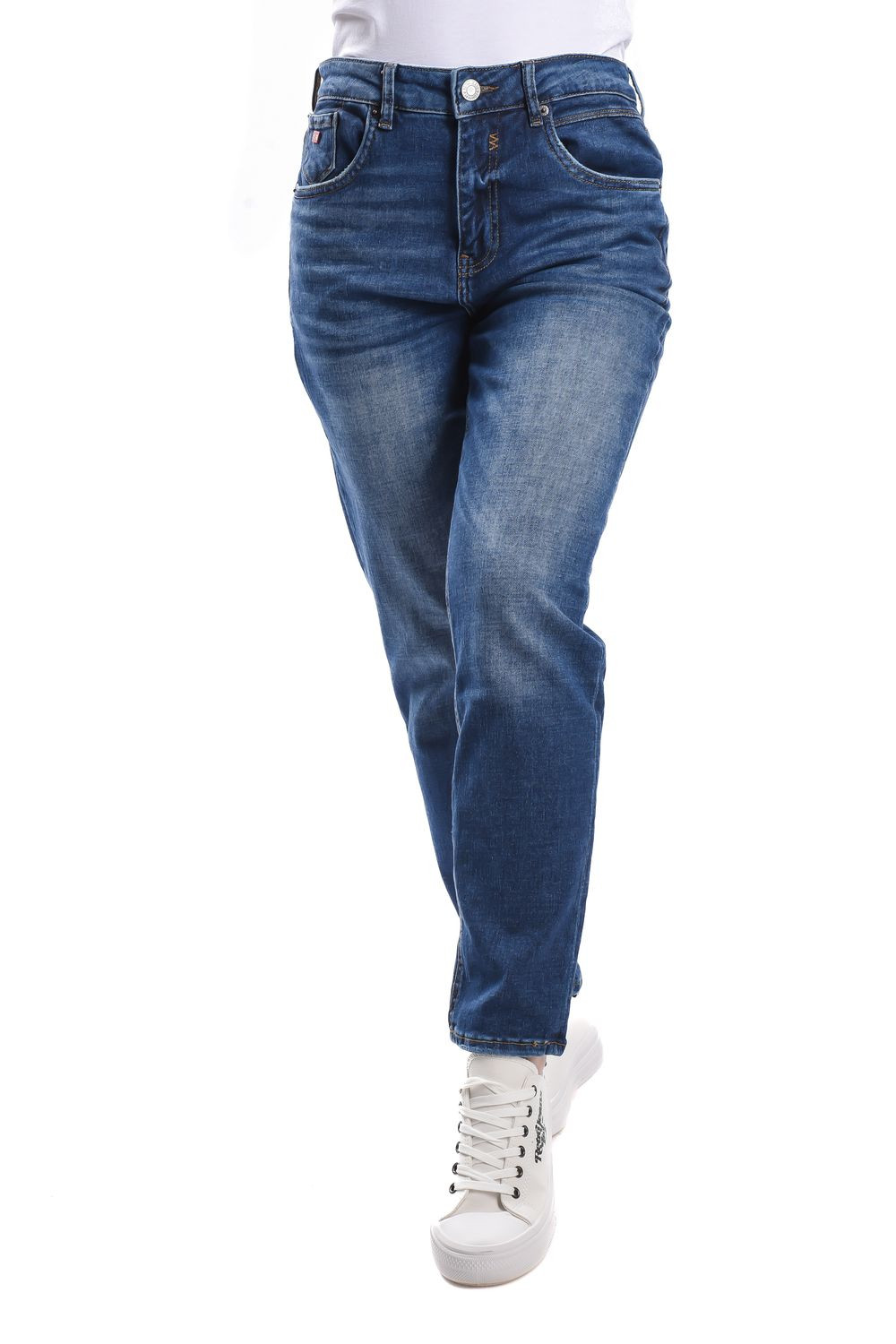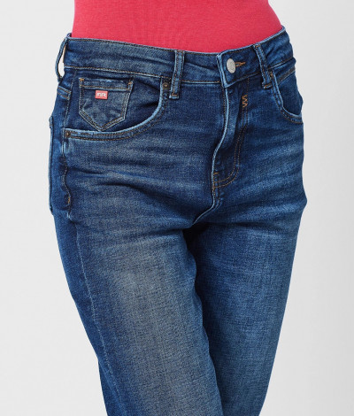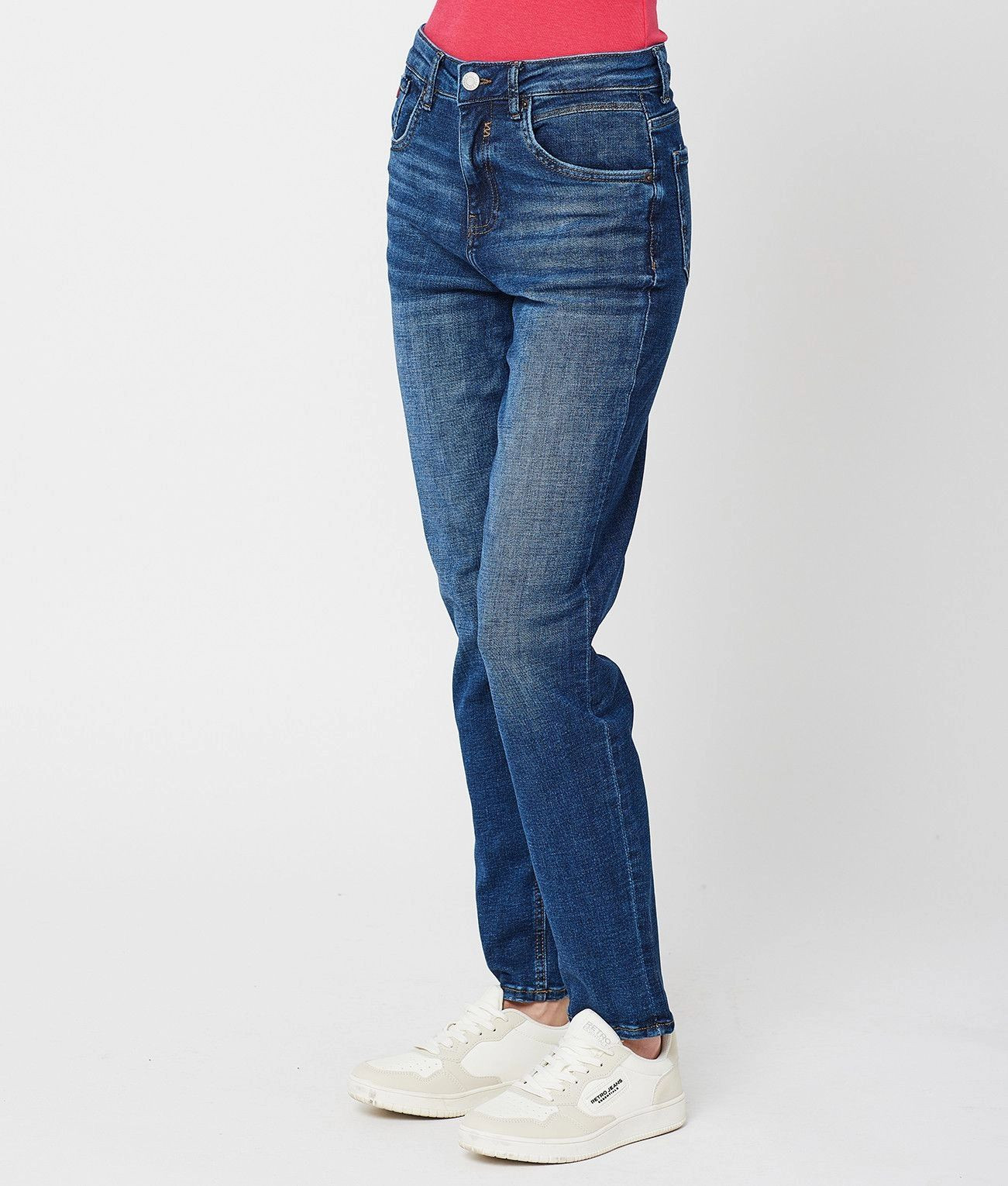 RetroJeans boyfriend fazonú női farmernadrág, sötét farmerkék színben, gombos és cipzáras záródással, koptatott, övbújtatós derékrésszel, klasszikus ötzsebes, derekán rávarrt- zsebén fém márkajelzéssel.