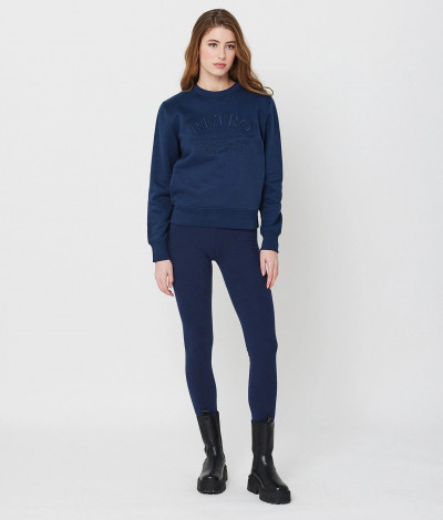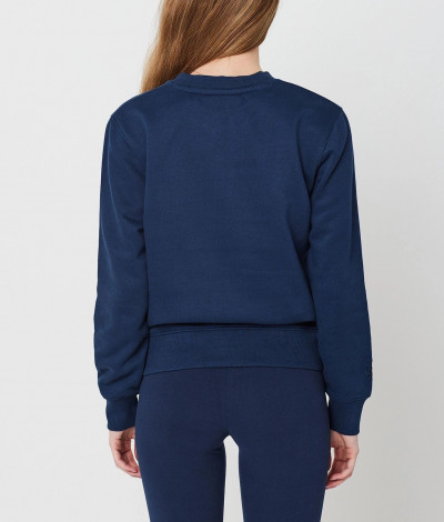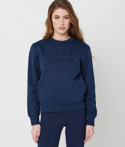 RetroJeans női pulóver, sötétkék színben, belseje bolyhozott, kerek nyakkivágással, bordázott passzéval, oldalzsebbel, elején hímzett márkajelzéssel.