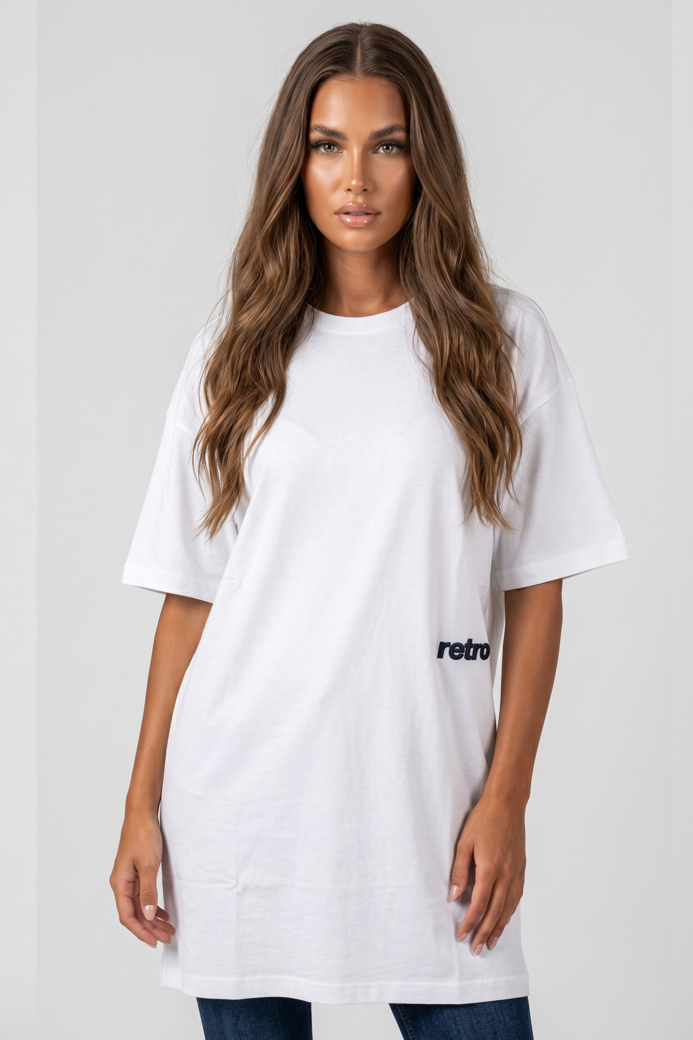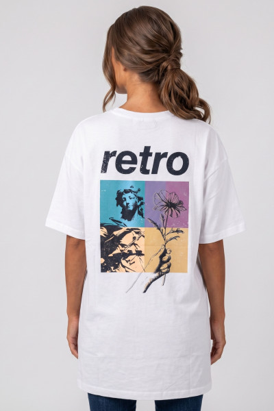 RetroJeans női póló fazonú ruha, fehér színben. Egyenes szabással, elején hímzett márkajelzéssel, hátán nagyméretű filmnyomott mintával és márkajelzéssel.