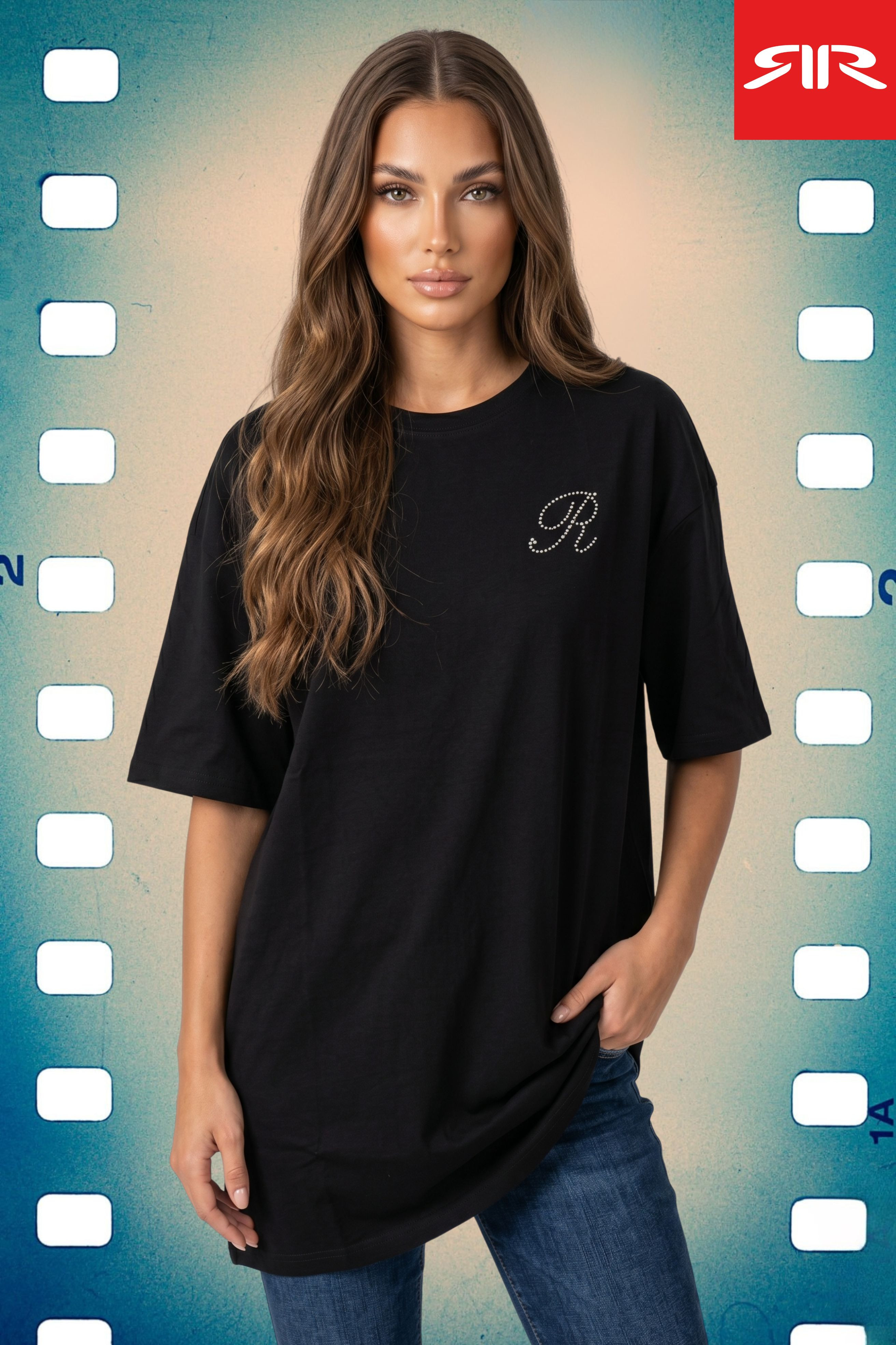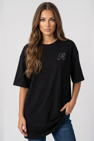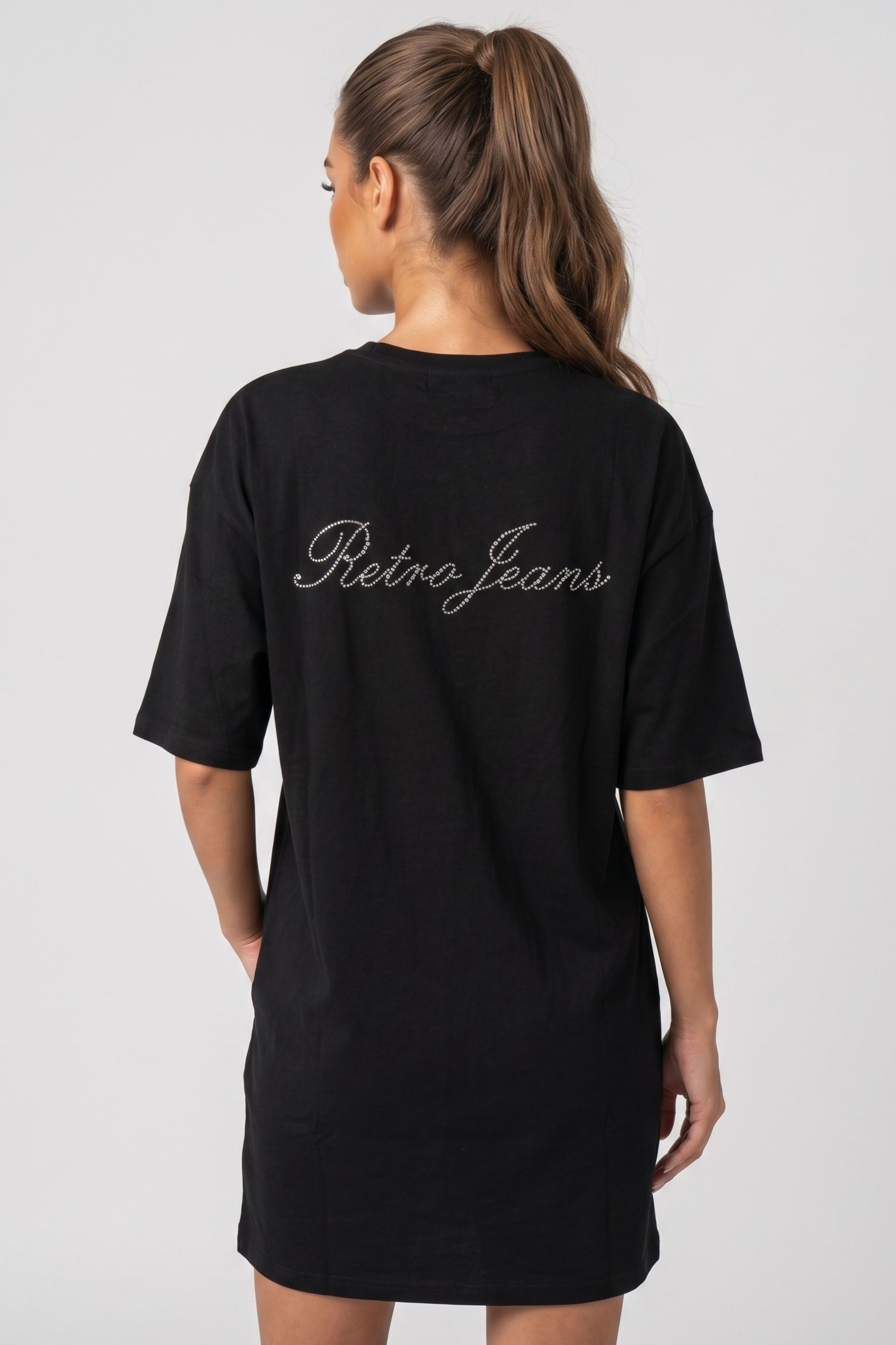 RetroJeans női póló fazonú ruha, fekete színben. Egyenes szabással, mell részén és hátán kövekkel kirakott márkajelzéssel.
